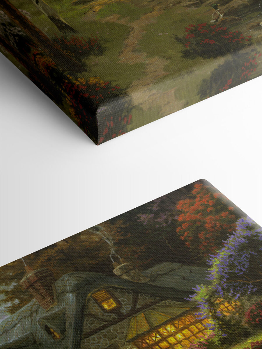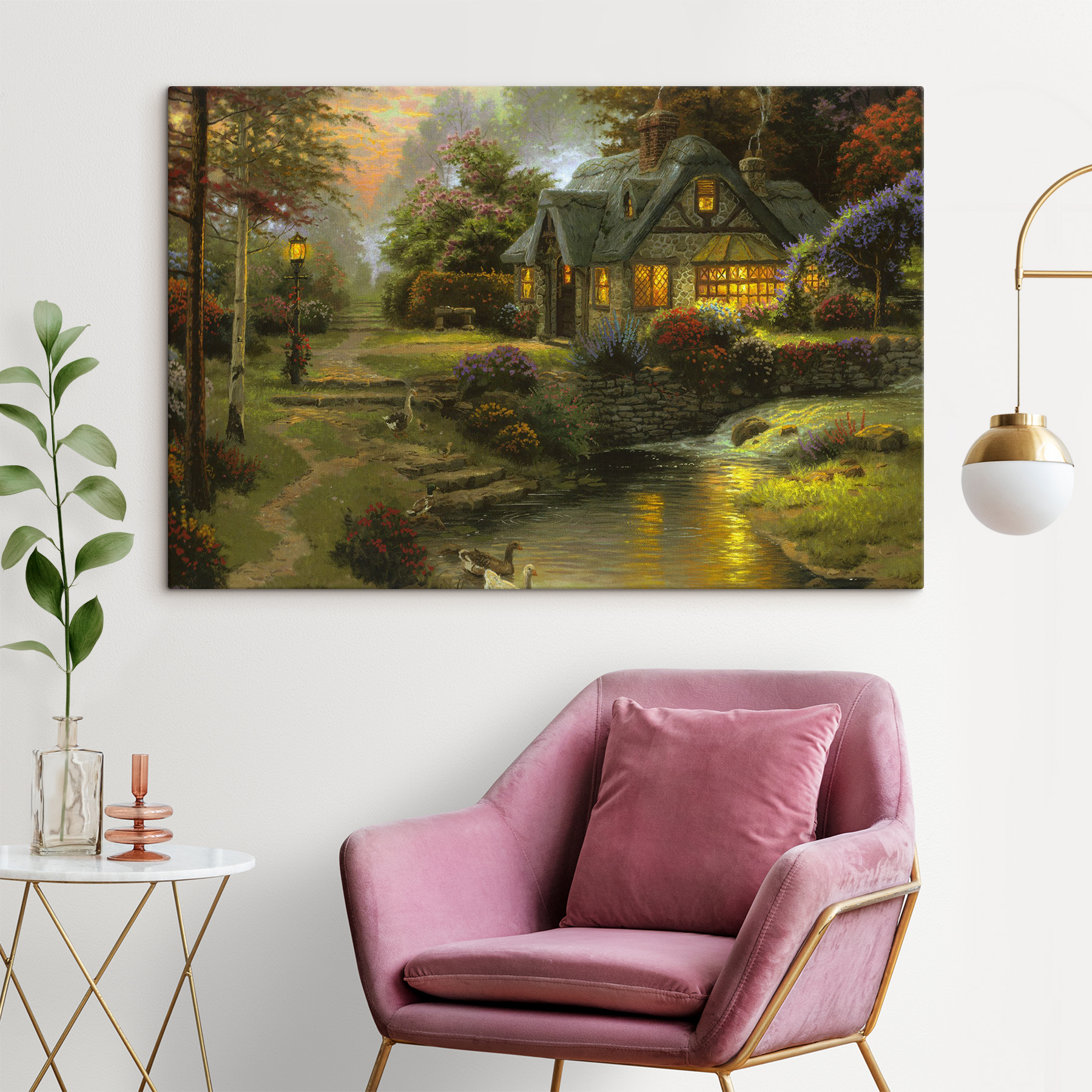 Ați visat vreodată să evadați la o căsuță confortabilă în pădure? Această imprimare pe pânză dă viață acestui vis. Cu o scenă fermecătoare, completată cu un coș de fum pufos care pufăie, este ca o îmbrățișare caldă pentru pereții tăi. Imaginează-ți că te plimbi pe acea cărare sinuoasă, cu un pârâu blând în apropiere și cu lumina blândă a felinarelor luminându-ți calea. Este perfect pentru cei care tânjesc după o notă de fantezie și căldură în casa lor. Fie că doriți să adăugați puțină magie lounge-ului dvs. sau să creați un colț confortabil de lectură, această piesă promite să vă transporte într-un loc unde totul este simplu și senin.