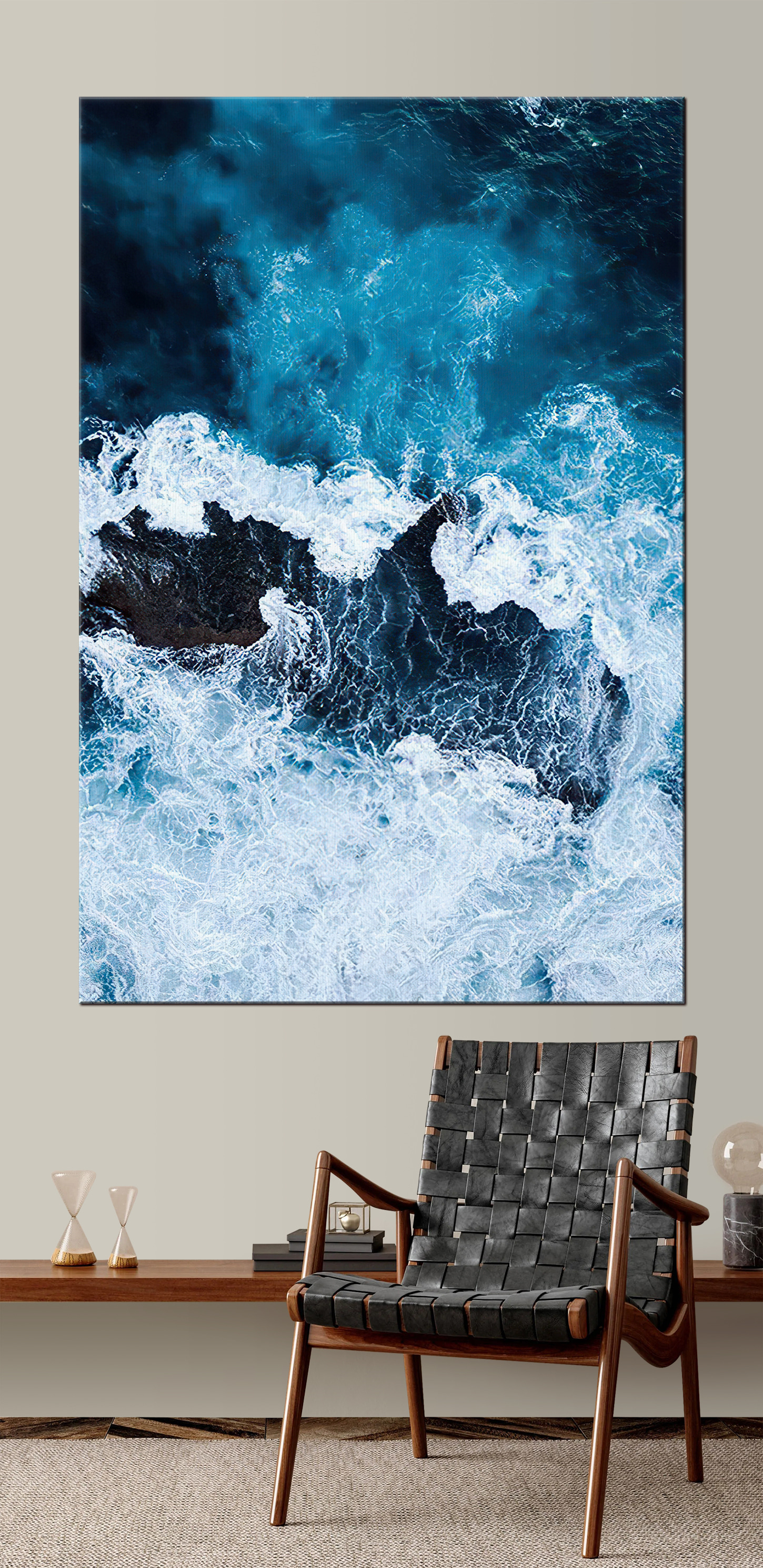 Scufundați-vă într-o evadare senină cu această imprimare captivantă pe pânză a valurilor care se sparg pe o stâncă aspră. Imaginați-vă stând pe o plajă, ascultând fluxul și refluxul ritmic al oceanului, în timp ce aerul sărat vă umple plămânii. Această operă de artă aduce acest vibe de coastă direct în spațiul dvs. de locuit, perfect pentru oricine visează la țărmuri nisipoase sau visează cu ochii deschiși la plajă. Albastrul vibrant și albul spumos fac aluzie la frumusețea sălbatică a naturii, ceea ce o face un subiect de conversație fantastic. Agățați-o în camera de zi sau în dormitor și lăsați energia calmantă să vă transforme spațiul – este ca o mini-vacanță fără a fi nevoie de cremă de protecție solară!