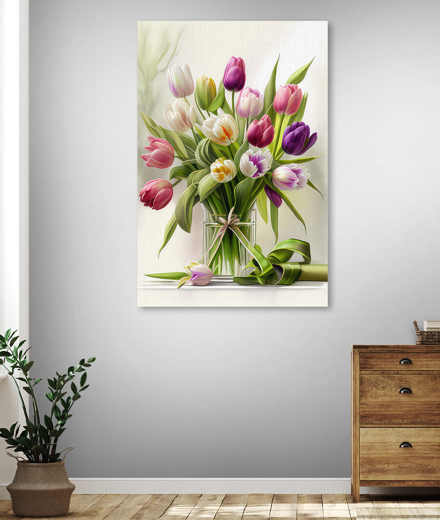 Dacă spațiul dvs. are nevoie de o explozie de bucurie și culoare, acest “Buchet vibrant de lalele colorate” imprimat pe pânză este exact ceea ce trebuie. Imaginați-vă că vă treziți în fiecare zi la o explozie de lalele pline de viață în toate culorile la care vă puteți gândi – roșu, purpuriu, galben, orice! Perfectă pentru orice cameră, vă va înveseli starea de spirit și pereții. Fie că este vorba de sufrageria, dormitorul sau chiar biroul tău, această piesă veselă te-a prins.