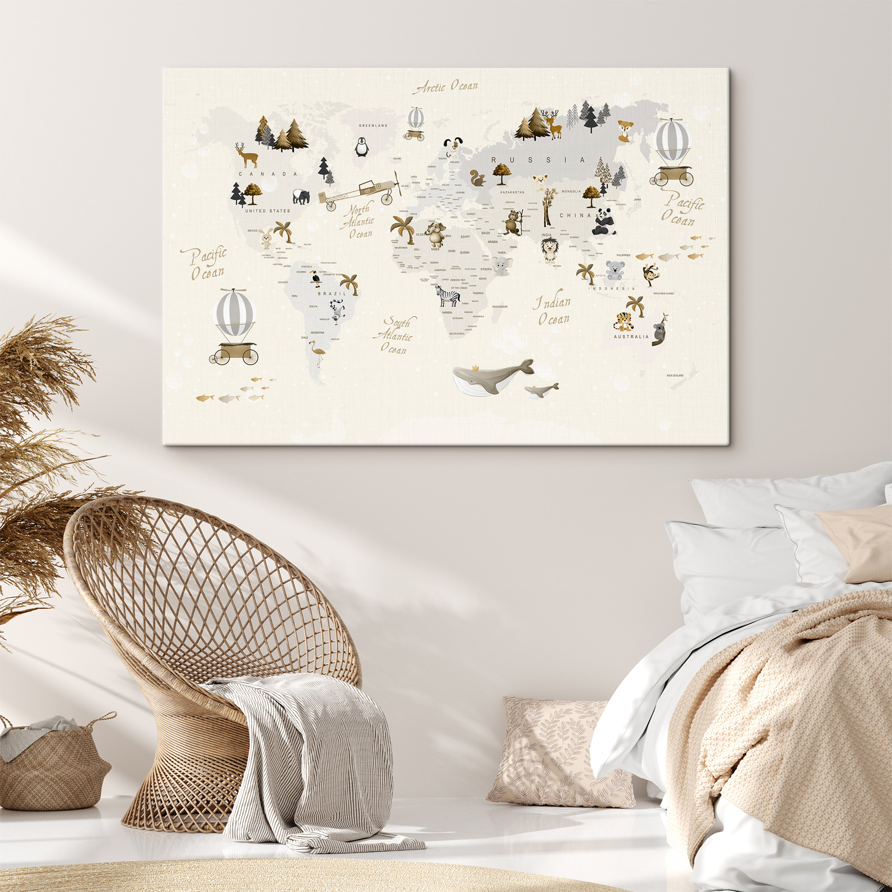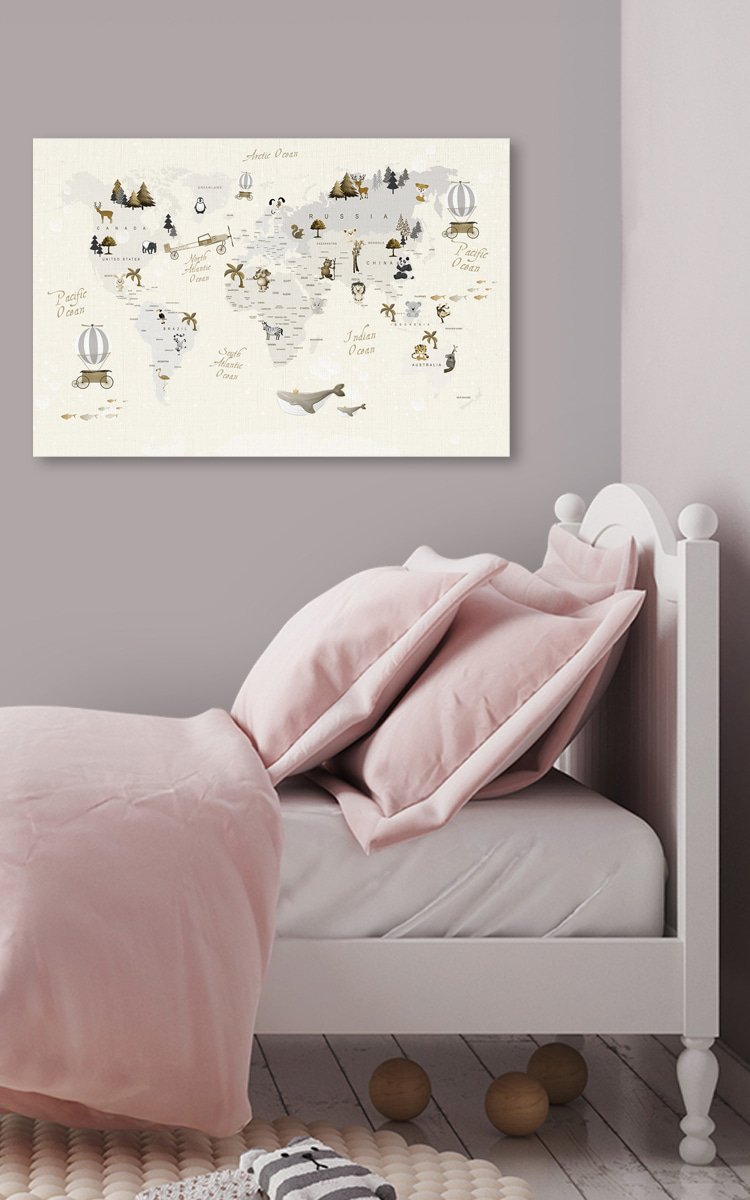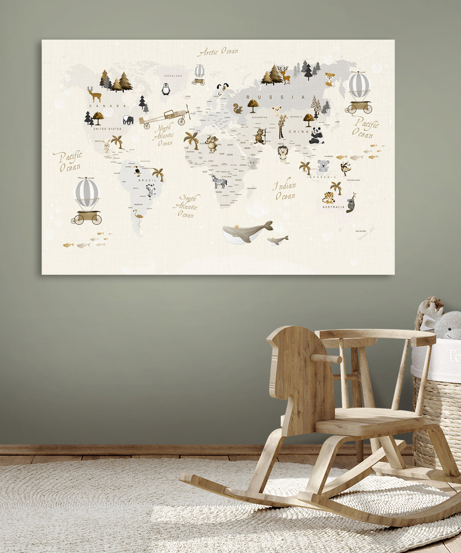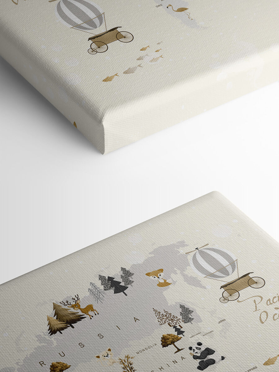 Bună ziua! Check out acest adorabil Canvas Print numit “Harta lumii cu animale” – perfect pentru a adăuga un vibe jucăuș la camera oricărui copil. Este ca o lecție de geografie amuzantă, artistică și plină de caracter. Imaginează-ți că micuțul tău își trasează degetele pe continente, descoperind unde stau pinguinii sau unde răcnesc leii.