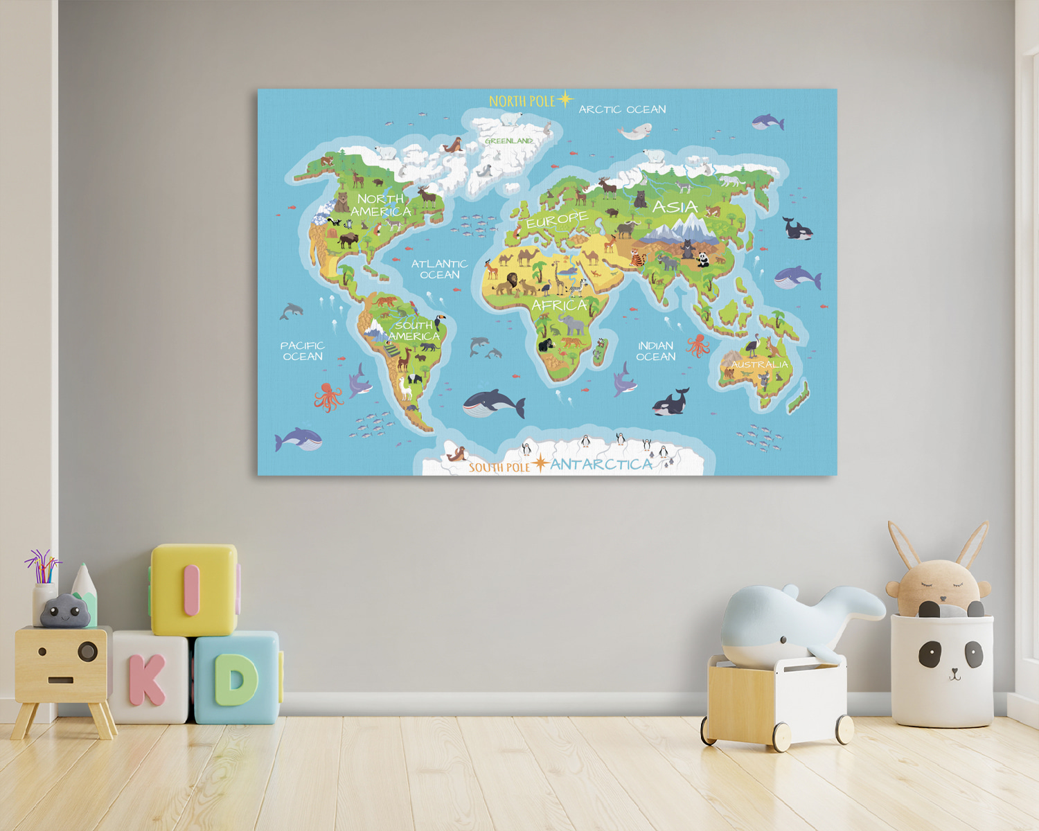 Înveseliți orice spațiu cu această imprimare pe pânză capricioasă, “Harta lumii cu animale”. Este ca o mini aventură pe perete, invitându-vă să explorați globul în timp ce vă observați creaturile preferate. Imaginați-vă-o în camera de joacă a unui copil sau chiar într-un birou confortabil de acasă – unde fiecare privire poate stârni un pic de dorință de călătorie. De la leii maiestuoși din Africa la pinguinii obraznici din Antarctica, este un festin vizual! Și să fim sinceri: cui nu-i place o caracatiță vorbăreață care se plimbă prin Pacific? Această piesă îmbină fără efort distracția și educația, făcând-o un accesoriu fermecător pentru orice stil de decor. Perfectă pentru a stârni imaginația și vibrații confortabile!