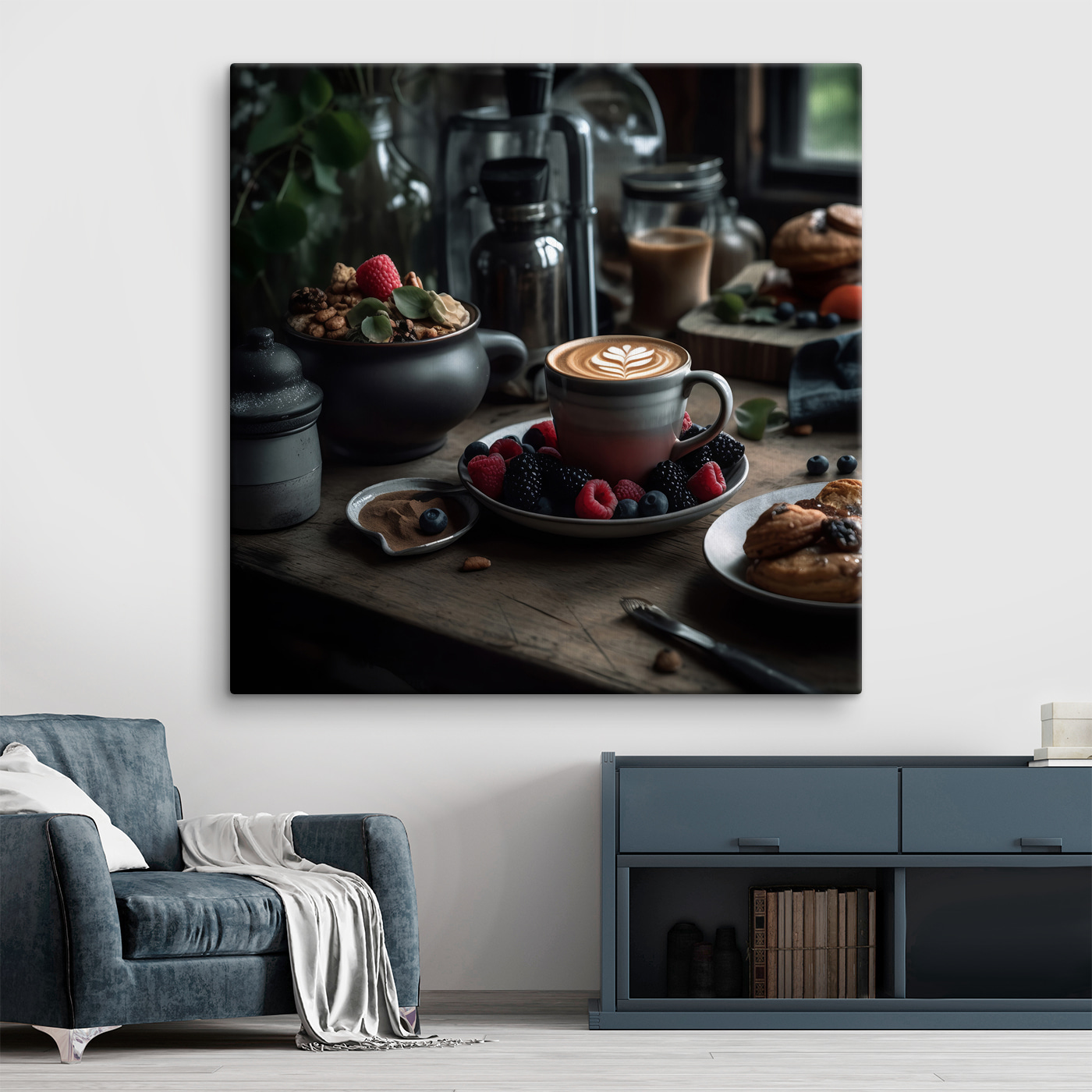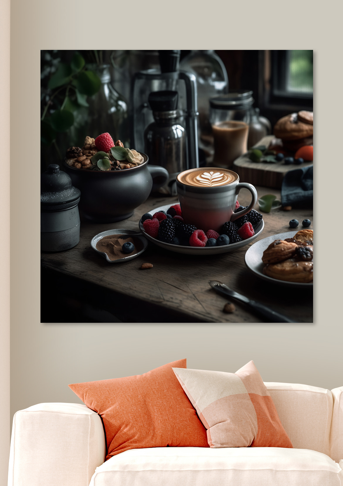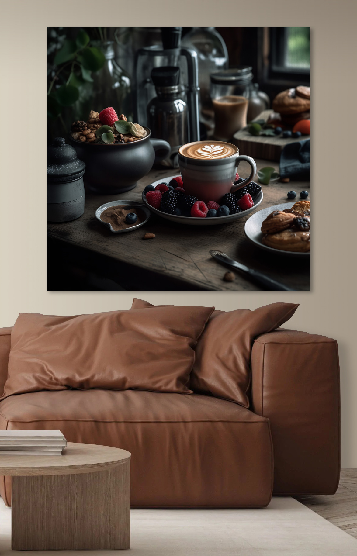 Înveseliți orice spațiu cu această imprimare încântătoare pe pânză, care prezintă o ceașcă de cafea încoronată cu artă uimitoare de latte, înconjurată de fructe și cereale vibrante. Imaginați-vă că intrați într-o bucătărie confortabilă sau într-o cafenea chic chiar în camera dvs. de zi – este ca o îmbrățișare caldă în formă de artă. Culorile bogate și primitoare ale cafelei și fructelor vor stârni cu siguranță bucurie. Este perfect pentru oricine își iubește băuturile de dimineață sau doar pentru cei care se bucură de o notă de fantezie în decorul lor. Pregătiți-vă ca oaspeții să vă întrebe unde pot lua o cafea cu lapte la fel ca aceasta! O pată de aromă pentru pereții dvs. și cui nu-i place puțină inspirație pentru micul dejun?