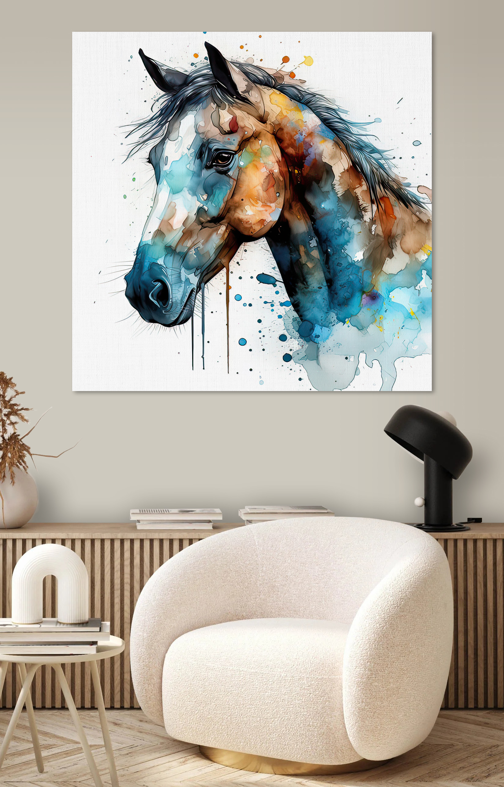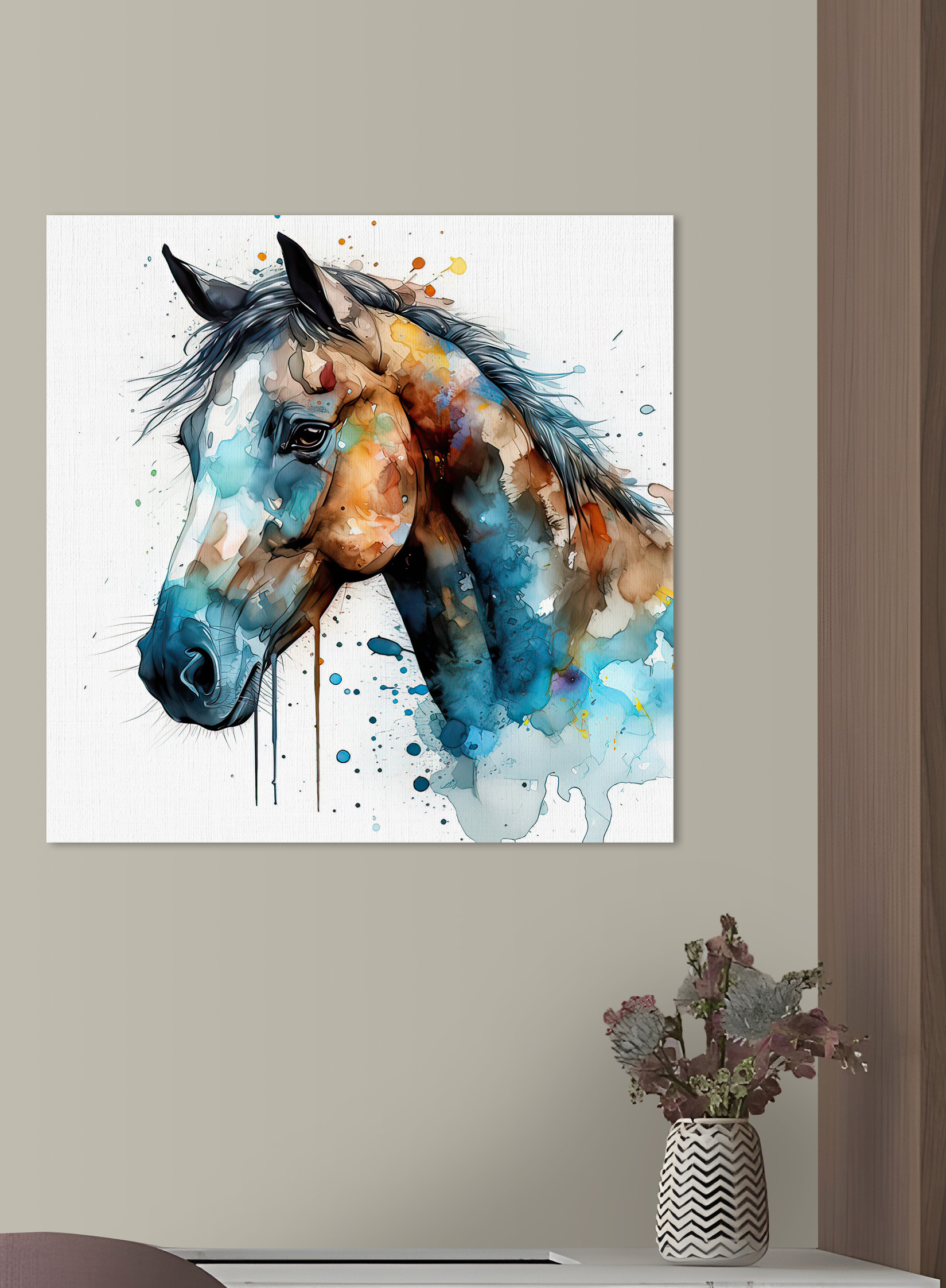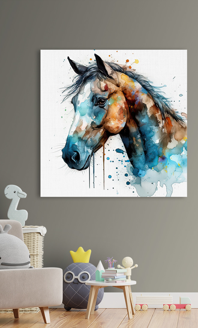 Transformați orice spațiu cu această imprimare pe pânză vibrantă a unui cal, stropit într-un vârtej de culori care par să danseze pe pânză. Imaginați-vă că treceți pe acolo și simțiți acea explozie de bucurie de fiecare dată când ochii vă aterizează pe această frumusețe artistică. Este ca și cum calul este pe cale să galopeze direct de pe perete, aducând un sentiment de viață și energie în camera ta. Perfect pentru iubitorii de cai sau pentru oricine dorește să adauge o notă de farmec sălbatic decorului său. Agățați-l în sufragerie și priviți cum oaspeții se opresc, zâmbesc și poate chiar împărtășesc o poveste sau două despre cai. Este mai mult decât artă; este un starter de conversație, o stare de spirit, și un strop de inspirație pentru orice zi.