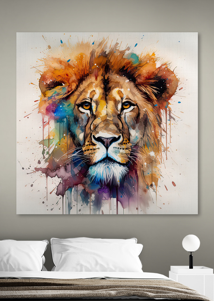 Imaginați-vă că intrați într-o cameră și sunteți întâmpinați de privirea feroce a unui leu, adus la viață vibrantă în această imprimare uimitoare pe pânză. Aceasta nu este doar o decorațiune oarecare; este o pată de culoare și creativitate care devine instantaneu un starter de conversație. Amestecul dinamic de stropi de acuarelă din jurul chipului maiestuos al leului îl face să pară că este gata să sară de pe perete.