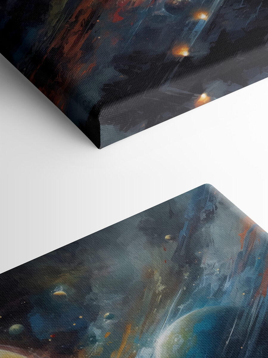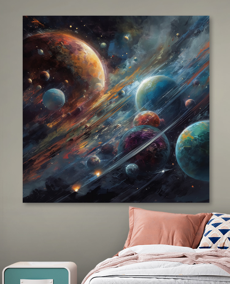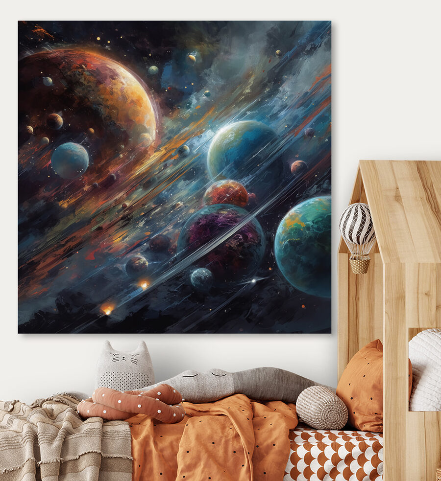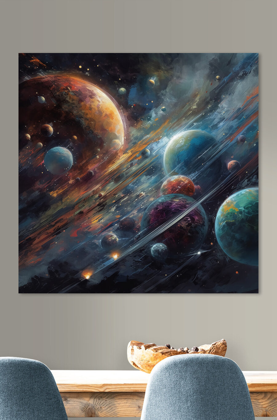 Imaginați-vă că pășiți într-un carnaval cosmic – chiar în sufrageria dumneavoastră. “Vibrant Planets in Cosmic Dance” surprinde magia spațiului. Serios, este ca și cum ai avea propriul tău univers personal pe perete. Perfect pentru camerele copiilor sau oriunde doriți un strop de culoare și uimire. Planetele rotitoare și cerul înstelat – absolut hipnotizant!