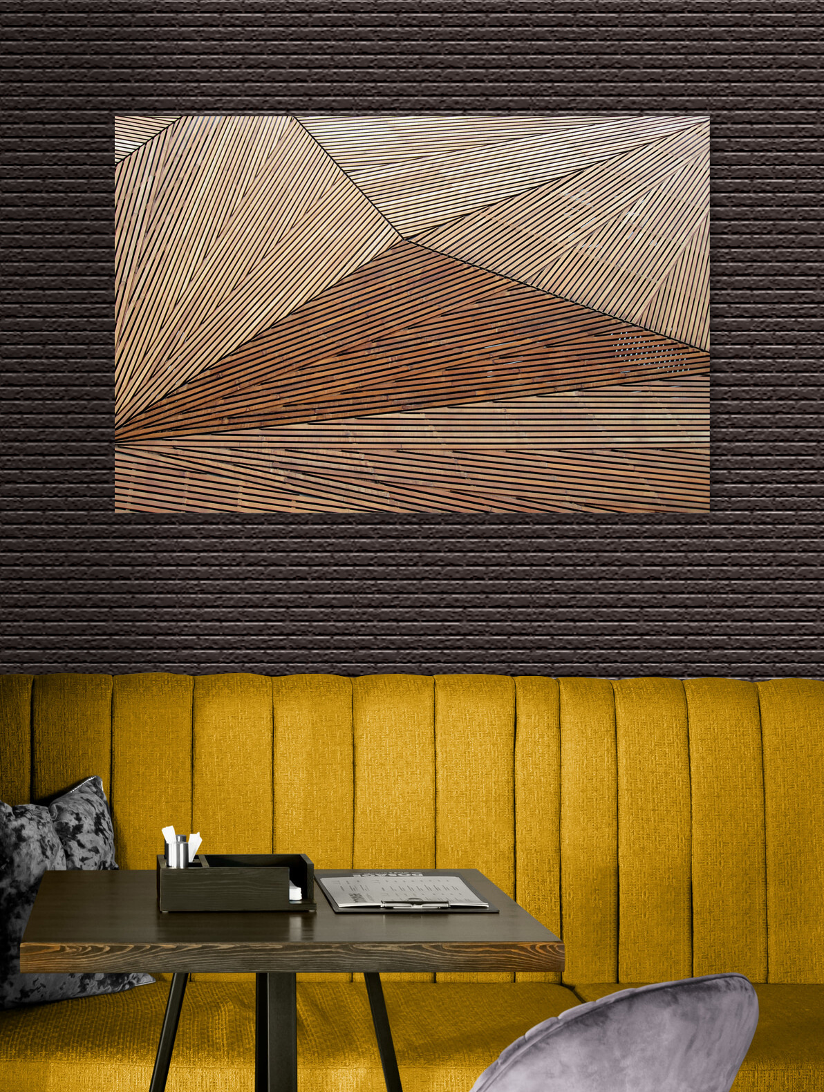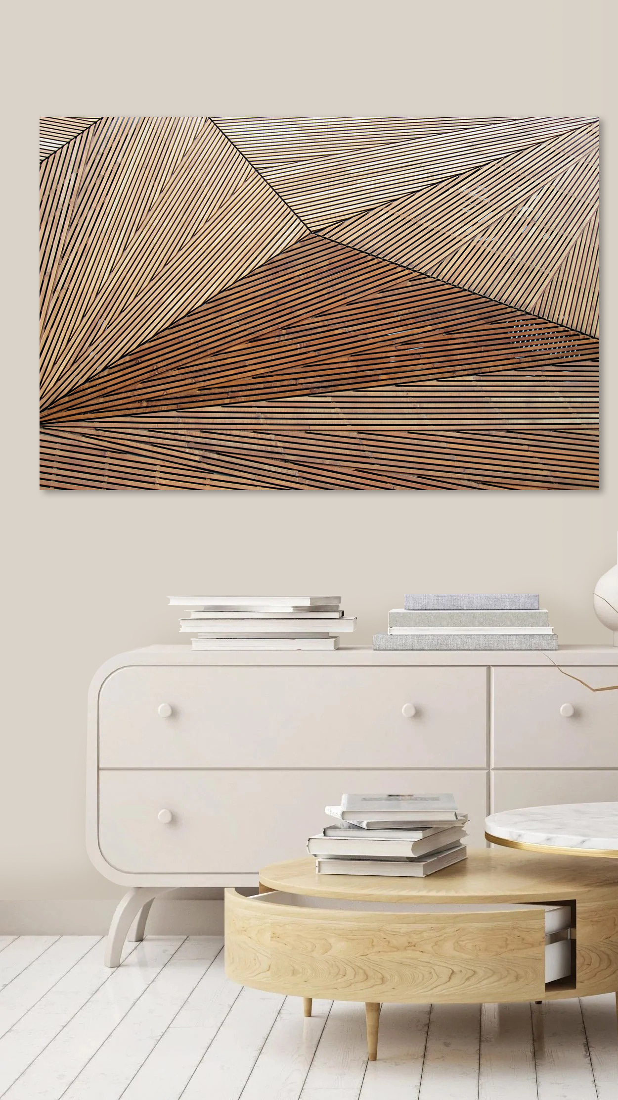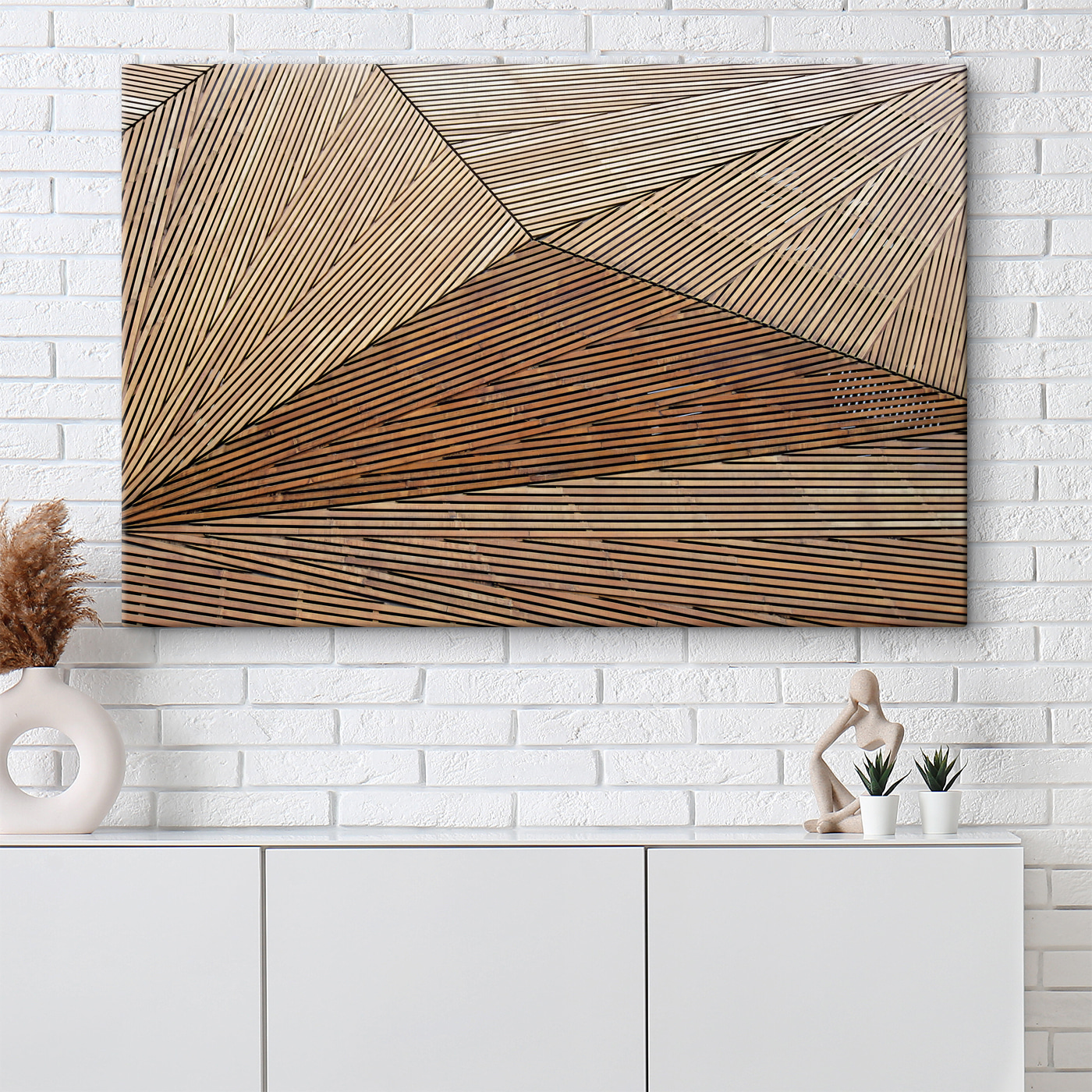 Imaginați-vă că intrați în sufrageria dvs. și vedeți această piesă uimitoare de pânză atârnată pe perete. “Modelul geometric din lemn cu linii” este ca o minune modernă – izbitoare, îndrăzneață și șic fără efort. Perfect pentru oricine iubește un amestec de arhitectură și estetică boho. Imaginați-vă grinzi de lemn care converg într-un dans al liniilor, creând un vibe care este în același timp liniștitor și intrigant. Este ca un starter de conversație care îi face pe oameni să spună: “Uau, asta e cool!” În plus, se potrivește în aproape orice stil – indiferent dacă doriți un colț confortabil sau un aspect elegant de loft. Este uimitor cum adăugarea acestei singure piese poate face ca spațiul tău să pară viu.