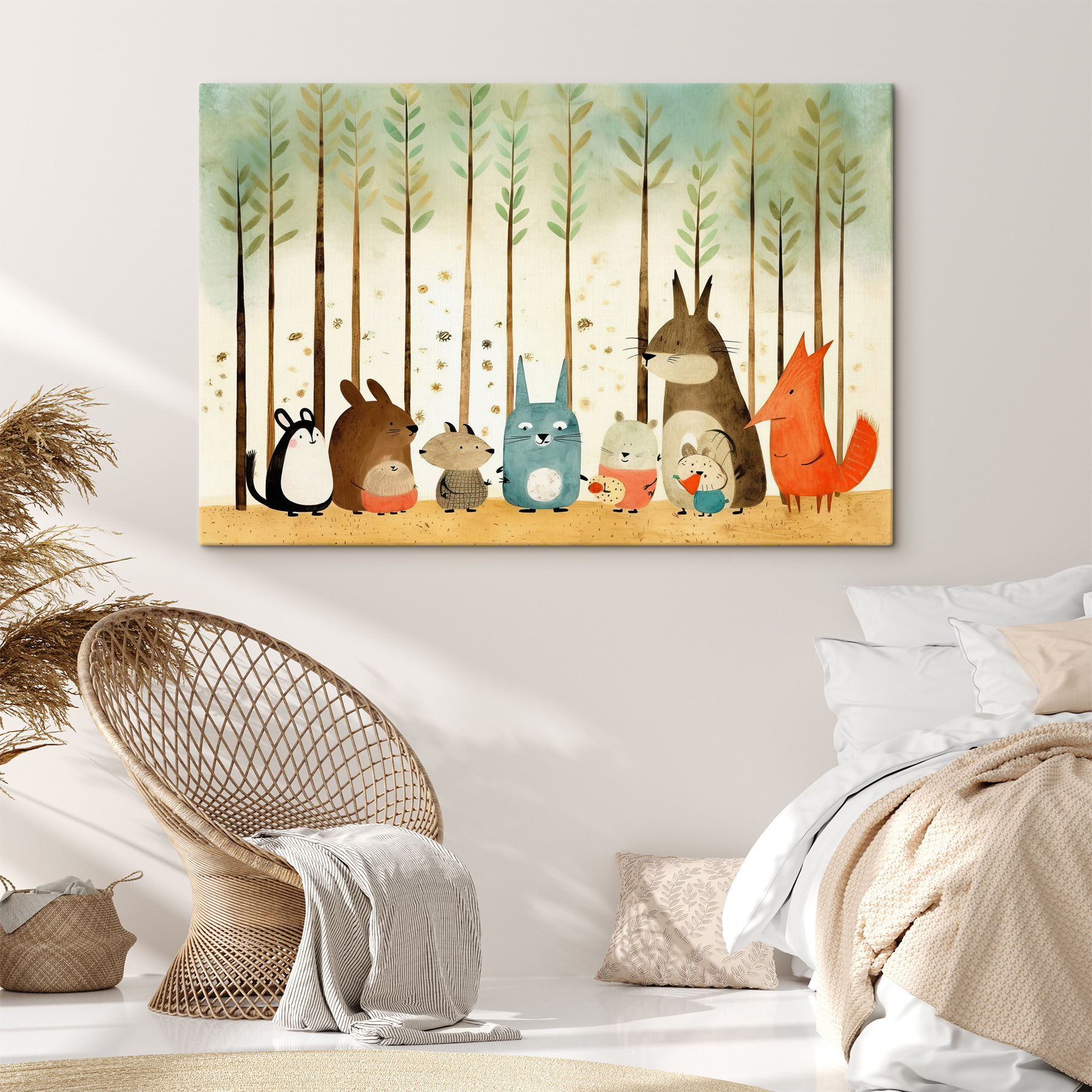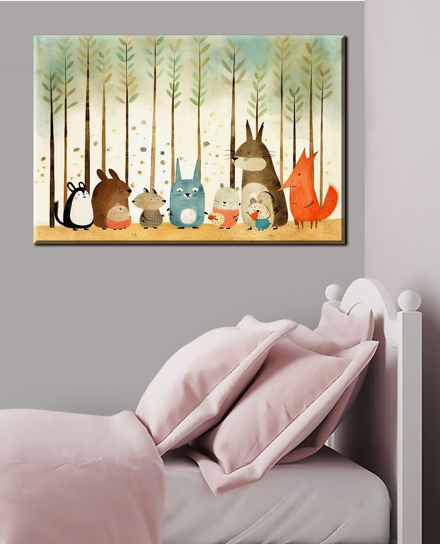 Aruncați o privire la această încântătoare imprimare pe pânză intitulată “Grup de animale în linie!” Perfect pentru a adăuga un strop de fantezie în camera oricărui copil, acesta prezintă o paradă fermecătoare de creaturi adorabile din pădure. Imaginați-vă că micuțul dvs. se trezește în fiecare dimineață cu acești prieteni jucăuși – este ca și cum ar avea o mini pădure chiar în dormitorul lor! Culorile moi și expresiile dulci îl fac să se simtă ca o scenă dintr-o carte de povești îndrăgită. Și cui nu i-ar plăcea vulpea perfect excentrică sau iepurașul vesel și rotund? Acest print se simte ca o îmbrățișare caldă din partea naturii, făcându-l o piesă minunată, fie că este pentru o cameră de copii, cameră de joacă sau doar pentru a adăuga o notă de veselie spațiului dvs. de locuit. Deci, de ce să nu invitați această gașcă adorabilă în casa dumneavoastră? Cu siguranță vor aduce câteva zâmbete și vor stârni câteva imaginații.
