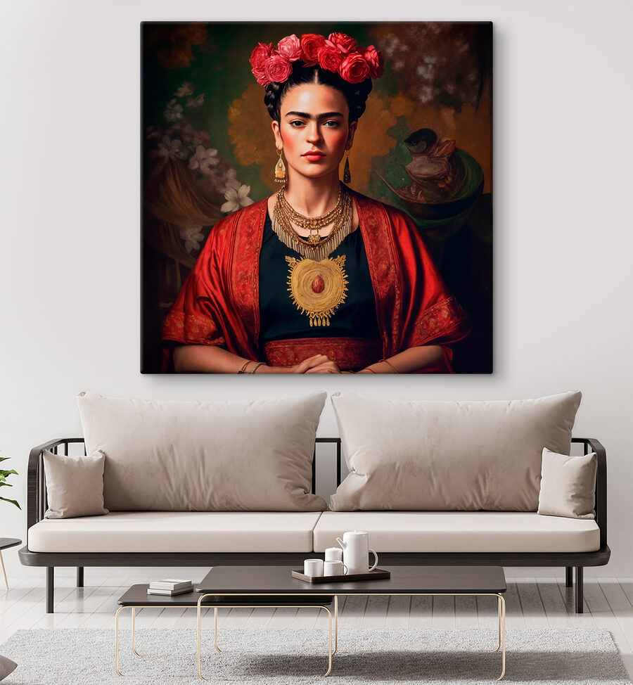 Imaginați-vă că intrați într-o cameră și vedeți această imprimare pe pânză vibrantă – este ca și cum energia întregului spațiu ar crește instantaneu cu o treaptă. Acest “Portret colorat cu coif floral” este un festin vizual, nu-i așa? Aceste flori luxuriante, privirea intensă și aceste culori bogate – nu poți să nu fii atras. Este ca și cum opera de artă ar avea un concurs de priviri cu tine, dar în cel mai bun mod.