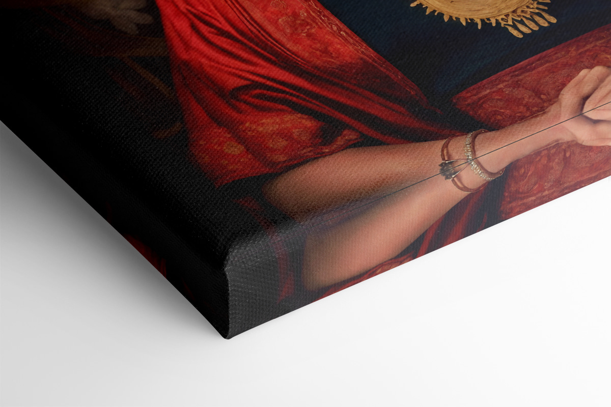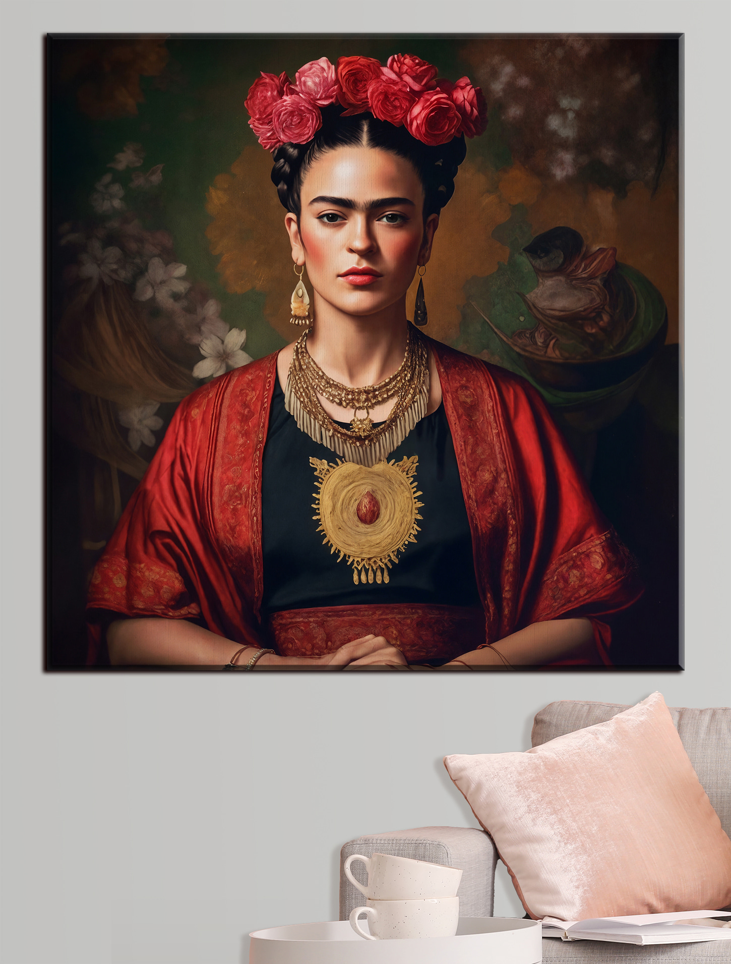 Imaginați-vă că intrați într-o cameră și vedeți această imprimare pe pânză vibrantă – este ca și cum energia întregului spațiu ar crește instantaneu cu o treaptă. Acest “Portret colorat cu coif floral” este un festin vizual, nu-i așa? Aceste flori luxuriante, privirea intensă și aceste culori bogate – nu poți să nu fii atras. Este ca și cum opera de artă ar avea un concurs de priviri cu tine, dar în cel mai bun mod.