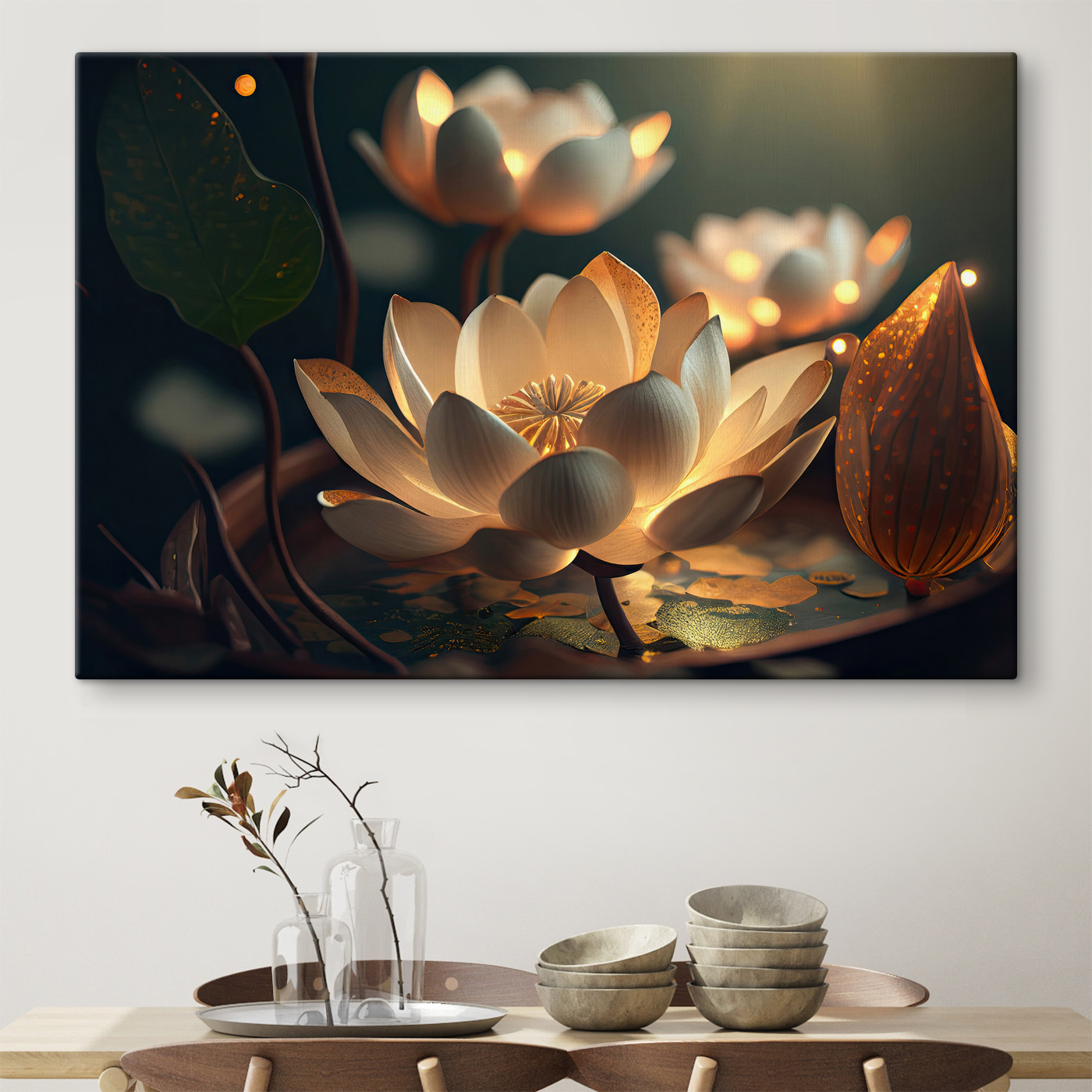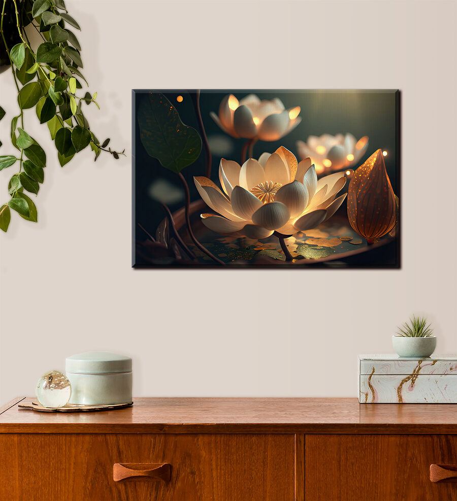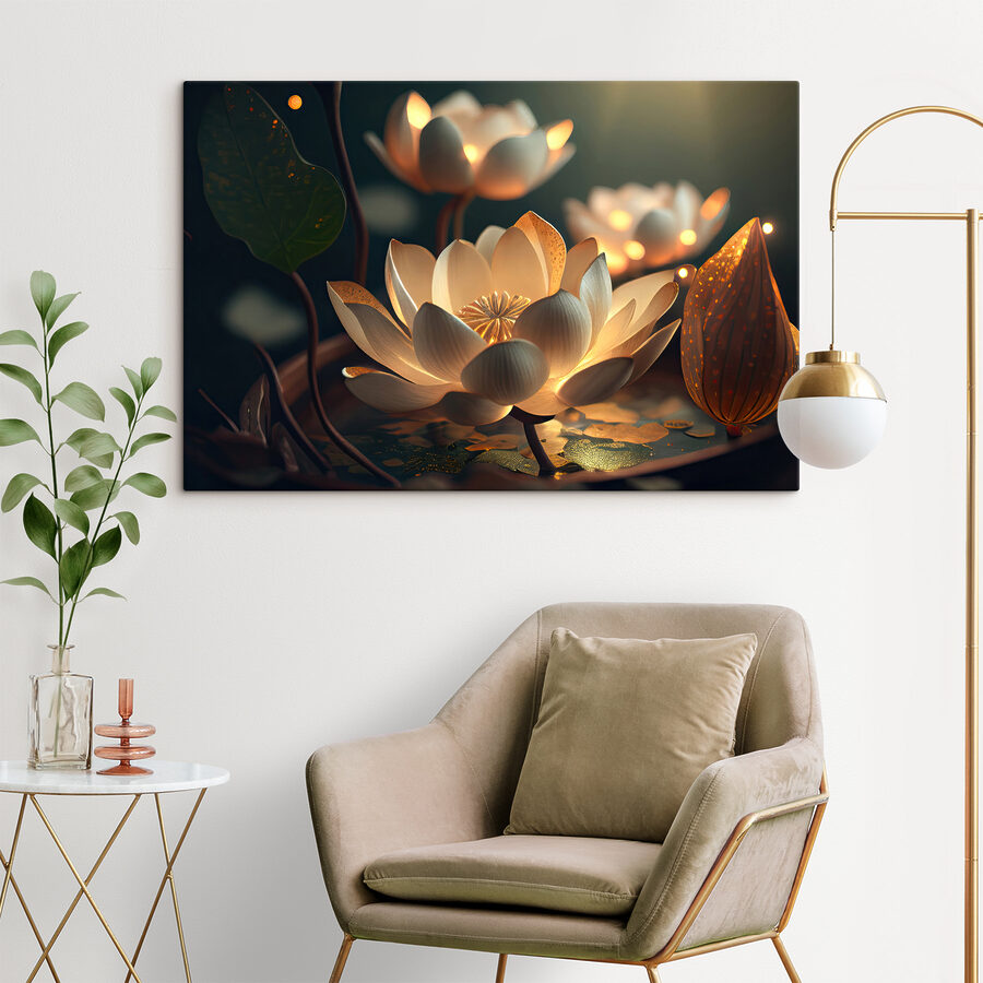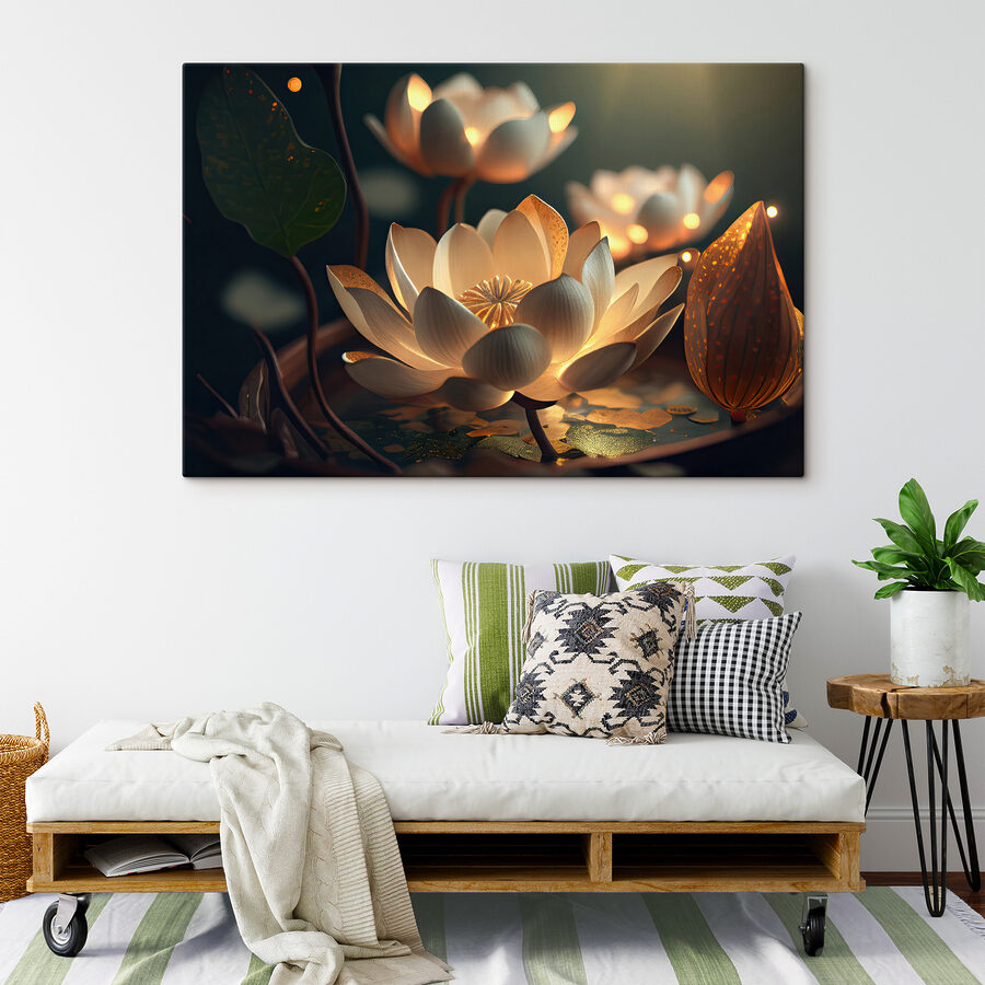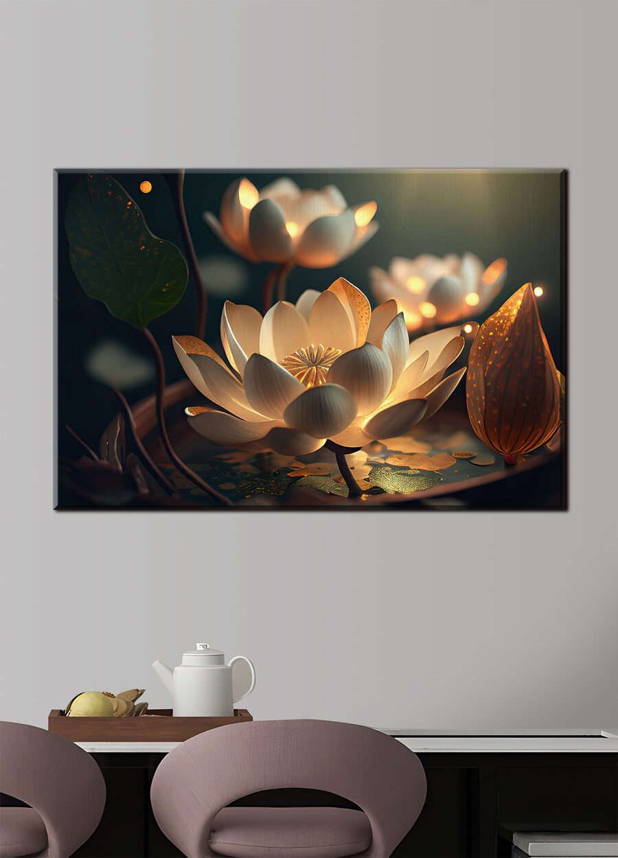 Transformați orice spațiu cu această imprimare uimitoare pe pânză cu flori de lotus iluminate. Imaginați-vă aceste petale moi strălucind ușor în întuneric, creând o atmosferă senină – perfectă pentru a vă relaxa după o zi lungă sau pentru a crea atmosfera pentru o noapte confortabilă. Culorile delicate dansează jucăuș una împotriva celeilalte, evocând un vibe fermecător care face dificilă privirea în altă parte. Fie că este atârnată în camera de zi sau într-un colț liniștit, această piesă de artă aduce o atingere de încântare calmă. Este ca și cum ai avea o mică bucată de natură chiar acasă, amintindu-le tuturor să facă o pauză, să respire și să aprecieze frumusețea din jur. Perfect pentru cei care apreciază decorul unic cu o poveste de spus!