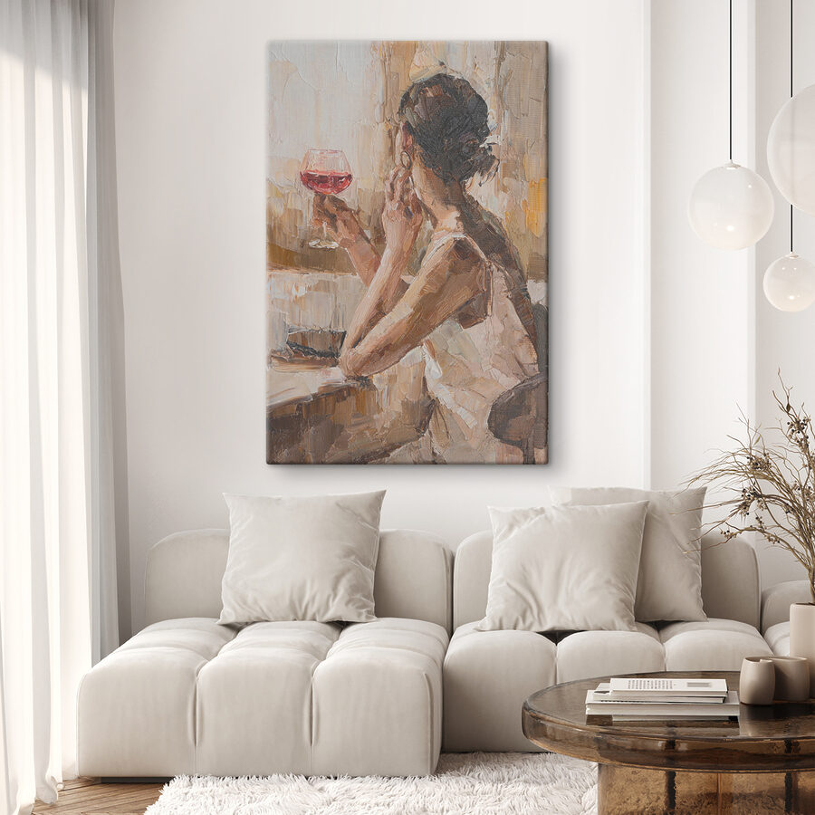 Pășiți într-un moment de calm cu această pânză captivantă care înfățișează o femeie savurându-și vinul. Există ceva aproape magic în felul în care lumina dansează peste paharul ei, invitând la visare cu ochii deschiși și la conversații calde. Această piesă șoptește despre seri confortabile, râsete cu prietenii și bucuria simplă a unui toast de modă veche. Perfectă pentru o cameră de zi sau un colț liniștit, aceasta adaugă o notă de căldură și eleganță oricărui spațiu. Imaginați-vă că vă relaxați cu o carte în apropiere, cu un pahar în mână, absorbind vibrațiile senine – o puteți simți? Această operă de artă este o sursă de conversație, un memento blând pentru a savura micile plăceri ale vieții.