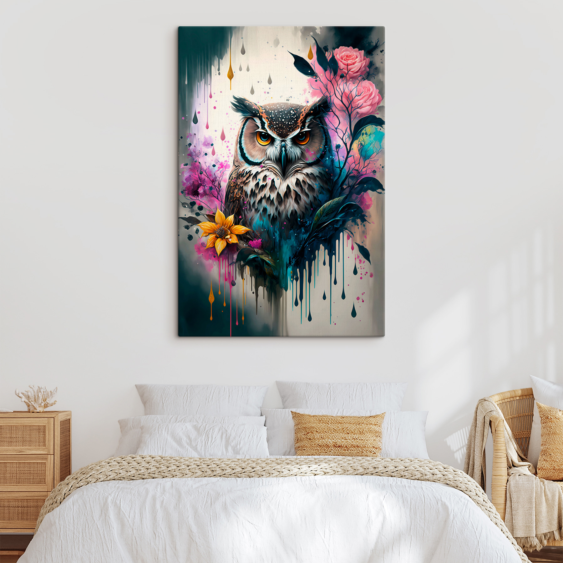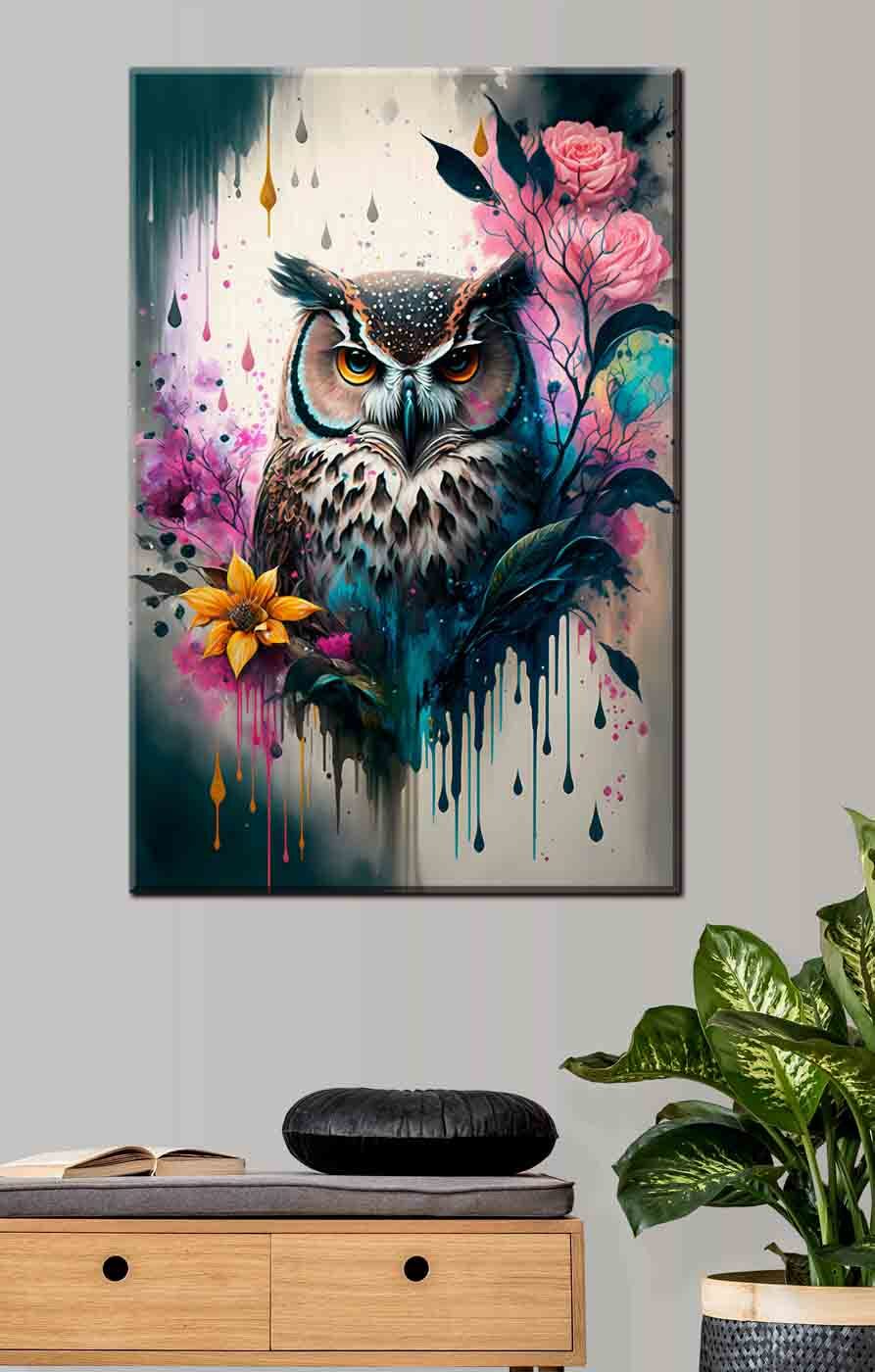 Aduceți o notă de farmec natural în spațiul dvs. cu această imprimare pe pânză vibrantă care prezintă o bufniță înconjurată de o explozie încântătoare de flori. Este ca și cum Mama Natură însăși a decis să organizeze o petrecere colorată! Bufnița uimitoare pare să vegheze asupra camerei, stârnind conversații despre aventuri la miezul nopții și povești din pădure. Imaginați-vă-o luminând un colțișor confortabil sau servind ca punct focal capricios într-o cameră de zi. Perfectă pentru oricine iubește partea sălbatică a vieții, această operă de artă vă transformă pereții într-o pânză a creativității și căldurii. În plus, cine ar fi crezut că o bufniță poate arăta atât de fabulos printre flori? Personalitatea nu lipsește de aici – lăsați-o să inspire zâmbete și un strop de bucurie în fiecare zi.