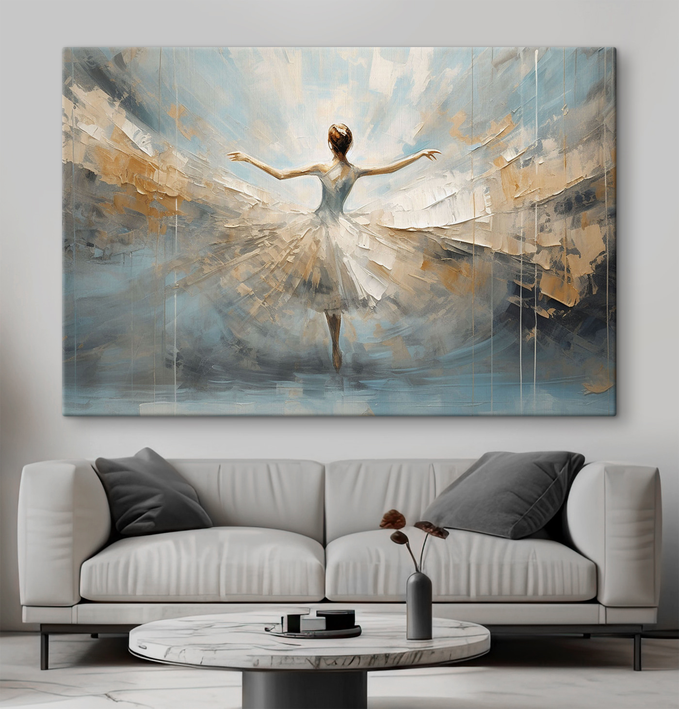 Intrați într-o lume a grației și a mișcării cu această imprimare captivantă pe pânză a unei femei într-o rochie albă. Ea pare să danseze chiar pe perete, răsucindu-se printre nuanțele moi de albastru și bej cald, creând o atmosferă care este atât liniștitoare, cât și inspiratoare. Imaginați-vă că vă plimbați pe lângă ea și vedeți eleganța ei mereu schimbătoare – în unele zile pare o briză proaspătă, în alte zile o șoaptă de nostalgie. Perfectă pentru a adăuga o notă de fantezie și farmec artistic unui colțișor confortabil sau unei sufragerii pline de viață, te face să îți dorești să te alături rotiței ei prin timp. Este ca o mică amintire a faptului că frumusețea există în mișcare și liniște, toate cuprinse într-o piesă de artă fabuloasă. Deci, ce zici de o discuție cu pereții tăi?