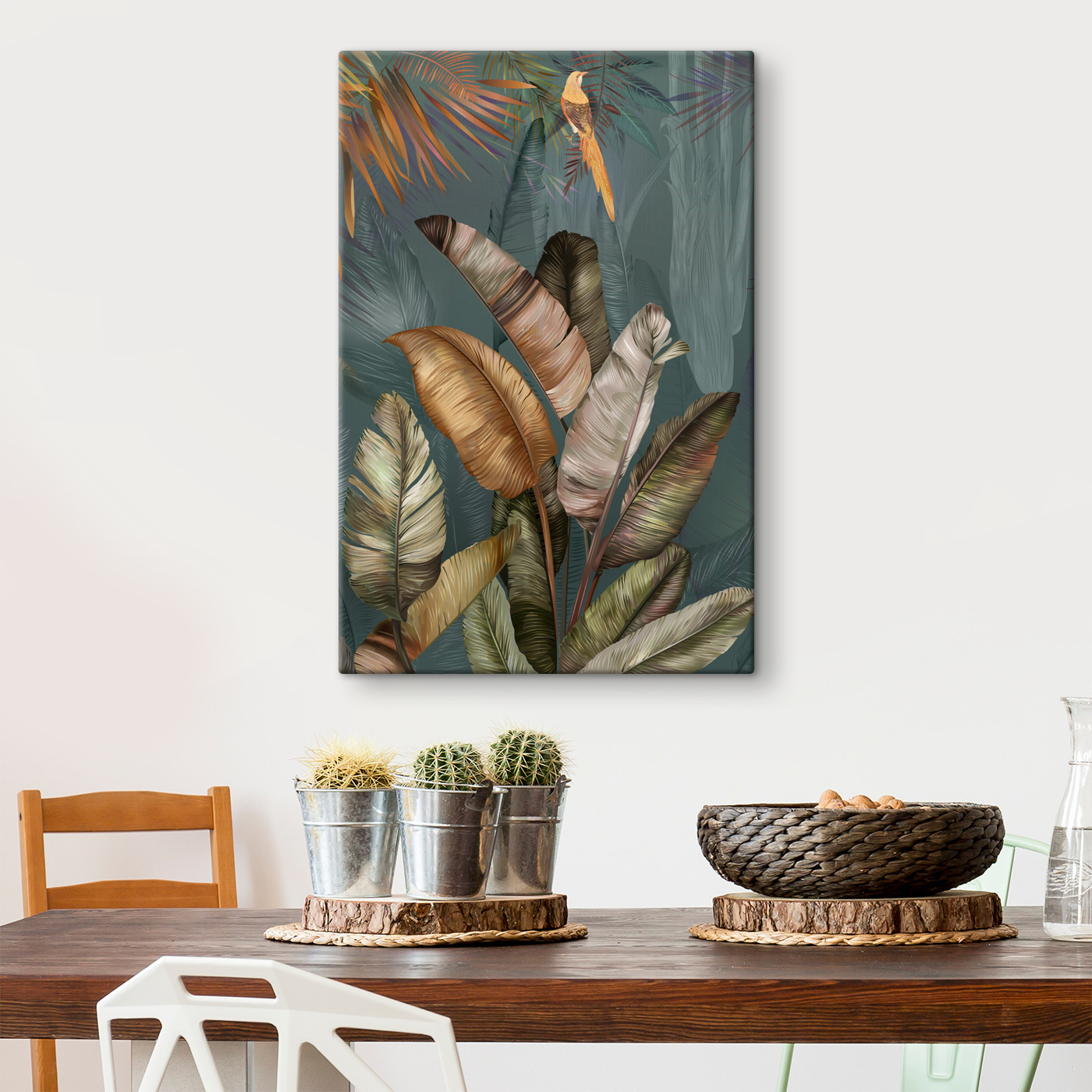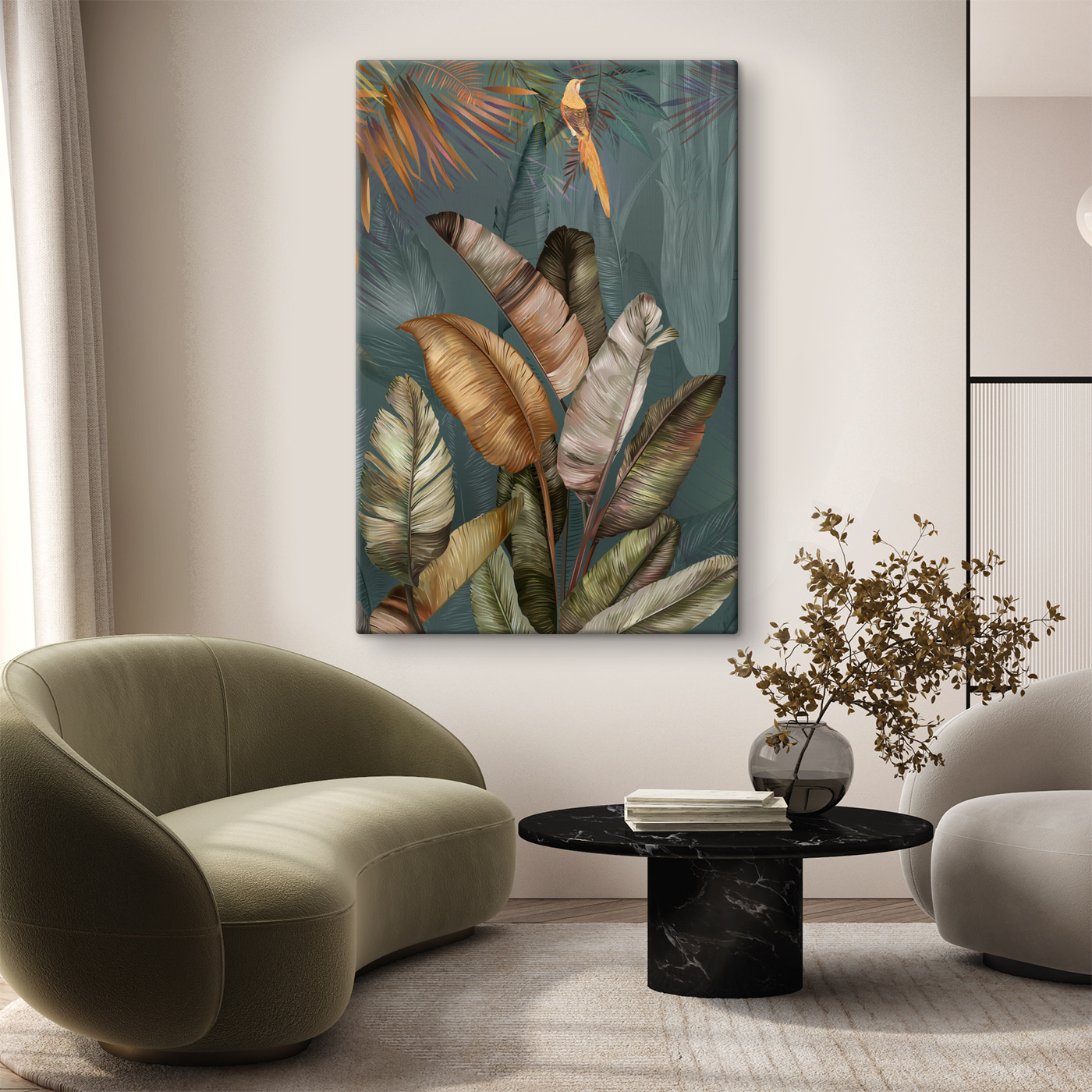 Partea interesantă? Nu există două frunze exact de aceeași culoare, adăugând această varietate subtilă, aproape hipnotică, care îți face privirea să rătăcească. Iar pasărea, cocoțată cu atâta încredere, îți reamintește să te relaxezi și să te bucuri de priveliște. Fie că urmăriți o atmosferă exotică sau doriți doar puțină seninătate inspirată de natură, acest print pe pânză face treaba de minune.