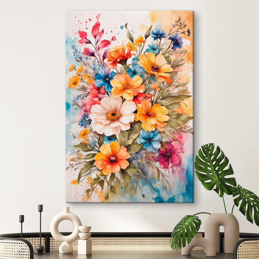 Hei, iubitor de flori! Imaginează-ți că intri într-o cameră și ești întâmpinat de o explozie de flori vibrante, pictate cu dragostea și măiestria pe care numai acuarela le poate aduce. Acest print pe pânză este ca un buchet care nu se ofilește niciodată – plin de portocaliu cald, albastru liniștitor și roz blând. Perfect pentru atunci când vrei ca spațiul tău să se simtă ca primăvara pe tot parcursul anului. Are acel vibe boho relaxat, dar bogat în detalii, ceea ce îl face un accesoriu fantastic pentru orice colț confortabil sau zonă de living plină de viață. Sincer, este ca și cum ai avea o mini grădină pe perete. Perfect pentru a visa cu ochii deschiși!