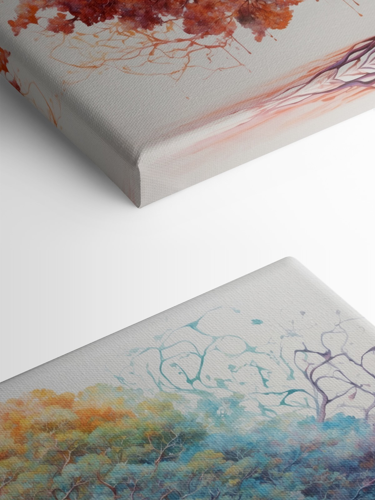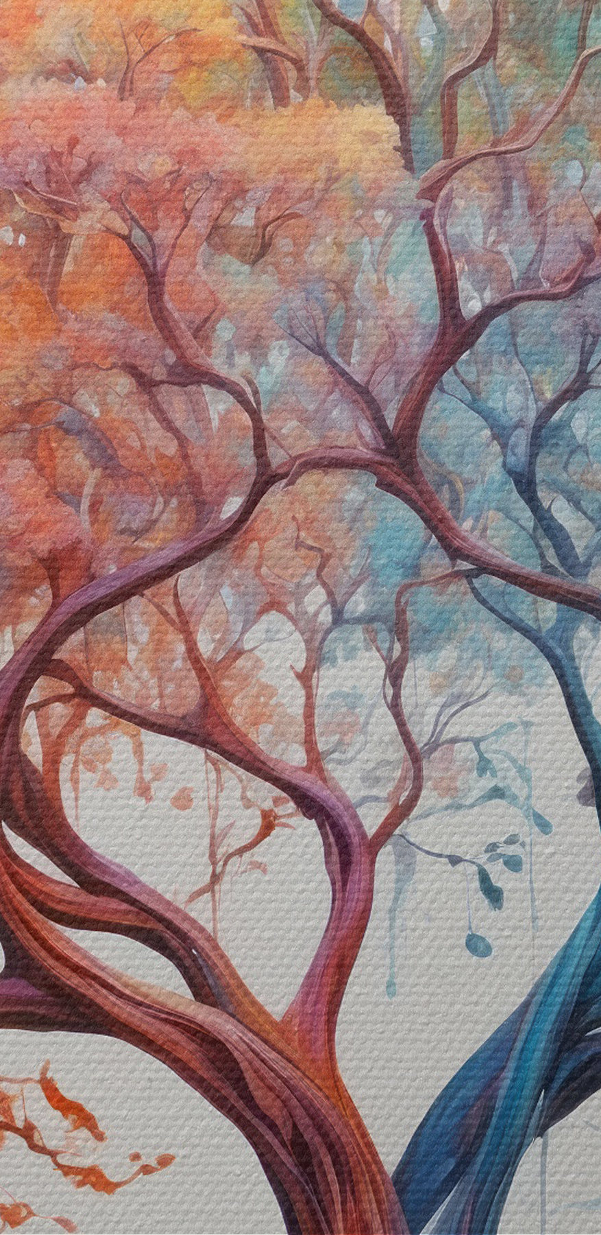 Imaginați-vă această imprimare pe pânză vibrantă agățată în camera dvs. de zi, este ca și cum ați avea o schimbare de sezon dintr-o privire! “Copac cu frunze de diferite culori” nu este doar o operă de artă; este un stimulent al dispoziției. Partea stângă strălucește cu nuanțe calde de portocaliu și roșu, ca o zi confortabilă de toamnă, în timp ce partea dreaptă răcorește lucrurile cu albastru și verde liniștit, evocând prospețimea primăverii.