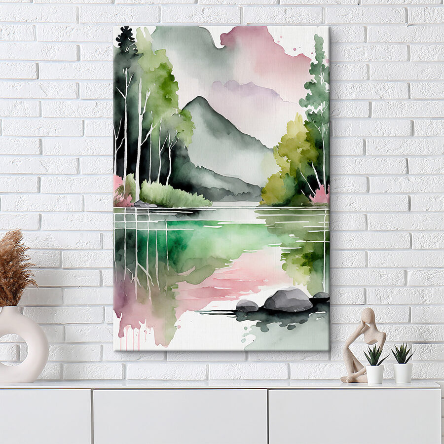 Imaginați-vă că veniți acasă după o zi lungă și sunteți întâmpinați de acest frumos print pe pânză acuarelă. Este ca și cum ați păși într-o escapadă senină pe malul lacului, chiar în sufrageria dvs. Amestecul pașnic de munți, copaci și un lac calm creează un sentiment de liniște perfect pentru relaxare. Culorile pastelate blânde sunt liniștitoare, dar verdele și rozul vibrante încă se remarcă și vă împrospătează spațiul. Ideal pentru acele momente de liniște cu o ceașcă de ceai sau o lectură ușoară. Este o mică felie din calmul naturii adunat într-o piesă de artă – serios, cine nu și-ar dori asta? O alegere atât de grijulie pentru oricine dorește să adauge o notă de frumusețe naturii fără a părăsi orașul.