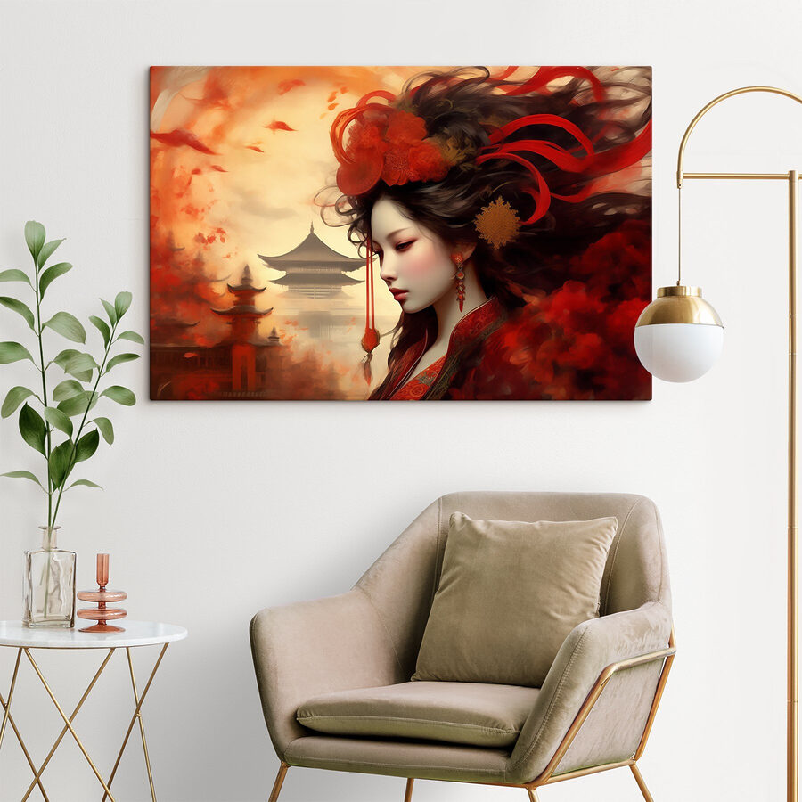 Imaginează-ți asta: intri în sufrageria ta și bam! Ochii îți aterizează pe această pânză uimitoare a unei femei cu părul lung și vaporos, împodobită cu flori roșii. Parcă ar face parte dintr-o poveste fermecătoare și nu te poți abține să nu te pierzi în detalii. Perfect pentru cei care adoră o notă de eleganță japoneză în decorul lor. Amestecul de vibrații tradiționale și culori vibrante – în special cele roșii – aduce o ambianță caldă și captivantă în orice spațiu. Este mai mult decât o simplă artă de perete; este ca și cum ai avea o parte dintr-un vis. Imaginați-vă stând cu o ceașcă de ceai, privind-o și simțind o undă de calm și inspirație. Perfect pentru un colțișor de lectură confortabil sau chiar o declarație îndrăzneață la intrare. Crede-mă, oamenii vor întreba despre gusturile tale fabuloase!
