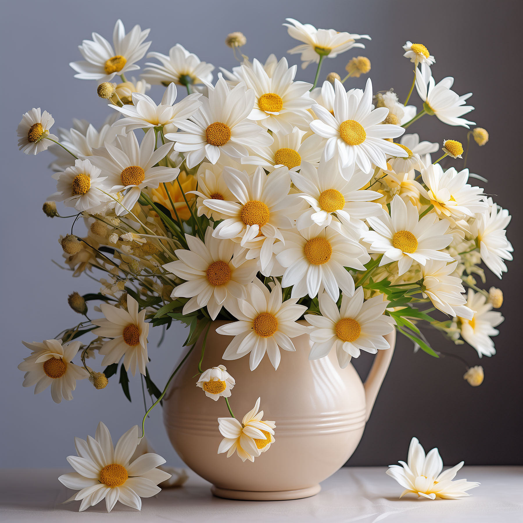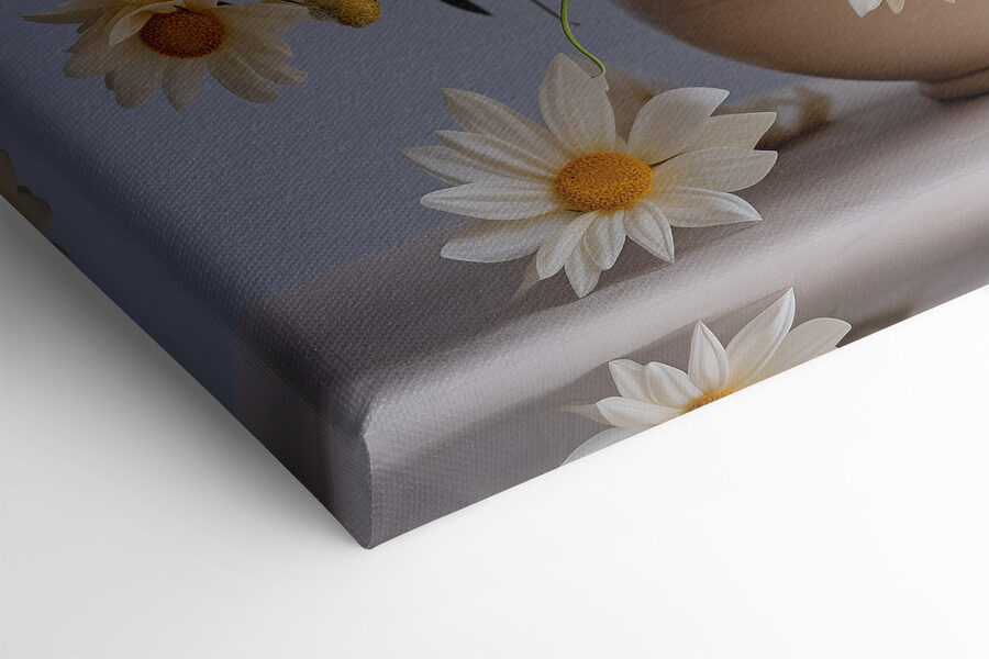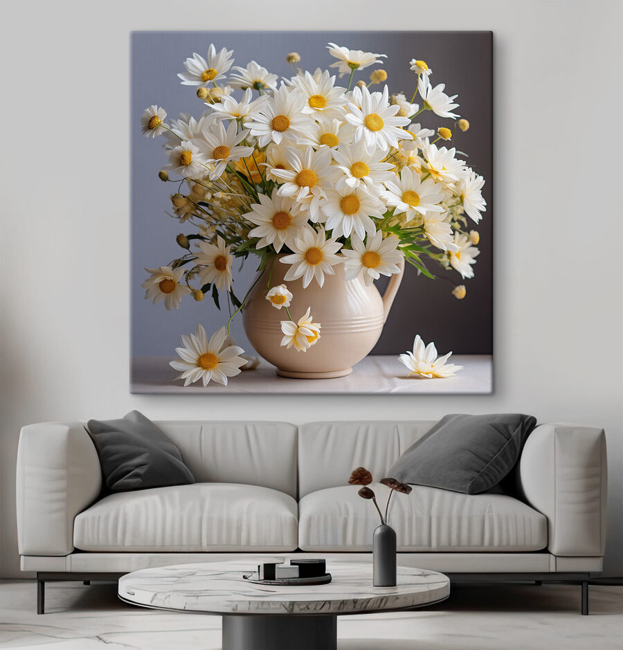 Înveselește-ți spațiul cu această încântătoare imprimare pe pânză cu margarete înflorind într-o vază fermecătoare din ceramică. Este ca o explozie de soare, chiar pe peretele tău! Imaginați-vă că intrați într-o cameră și simțiți instantaneu acea vibrație veselă, ca și cum tocmai v-ați plimbat printr-o grădină însorită. Dansul jucăuș al petalelor și culorile vibrante invită la zâmbete și căldură, făcându-l perfect pentru orice colț care are nevoie de un strop de viață. Nu este doar un decor; este un starter de conversație, o mică felie de natură care nu se ofilește niciodată. Cine nu și-ar dori să simtă un pic din acea bucurie de zi cu zi? Transformați-vă pereții și lăsați margaretele să își facă magia!