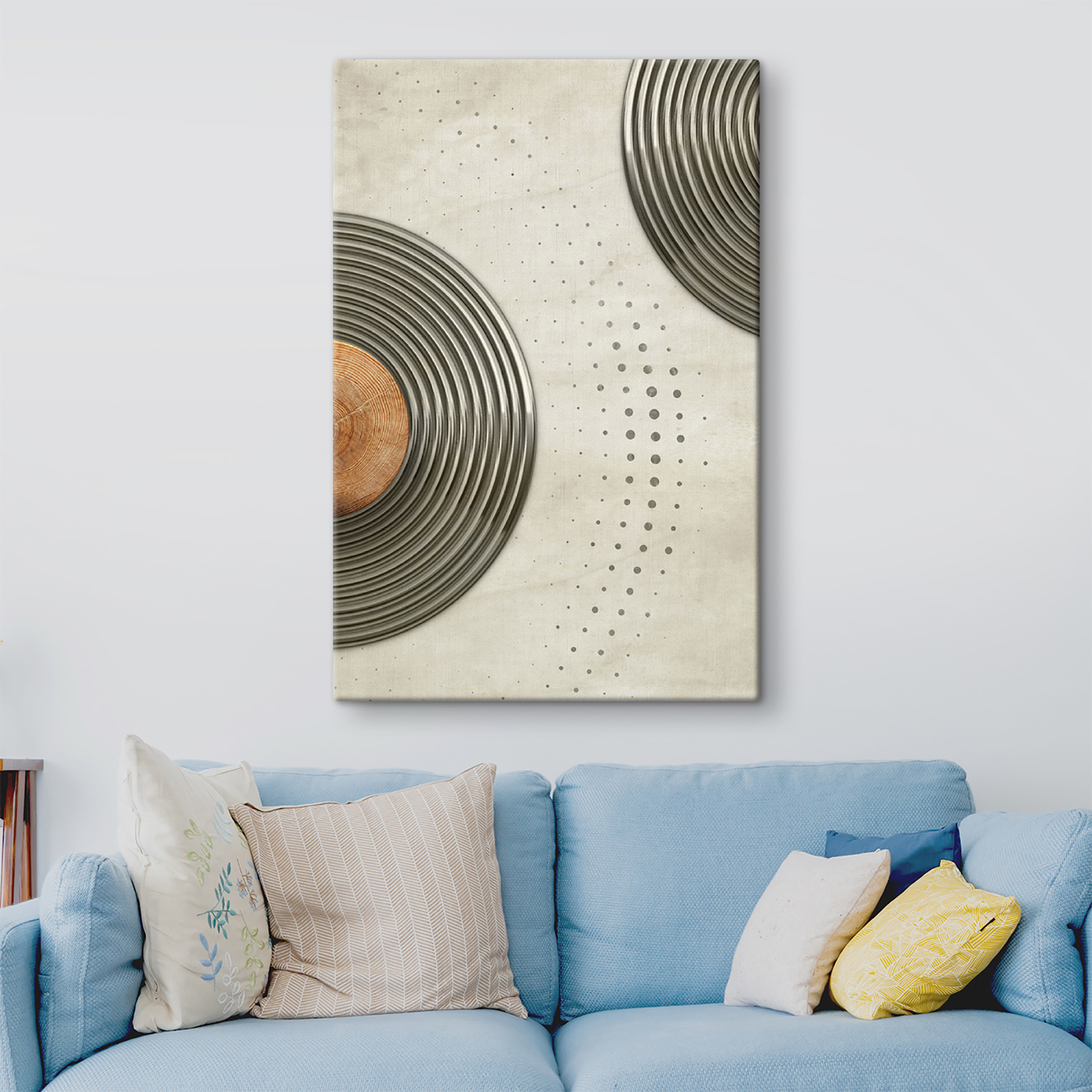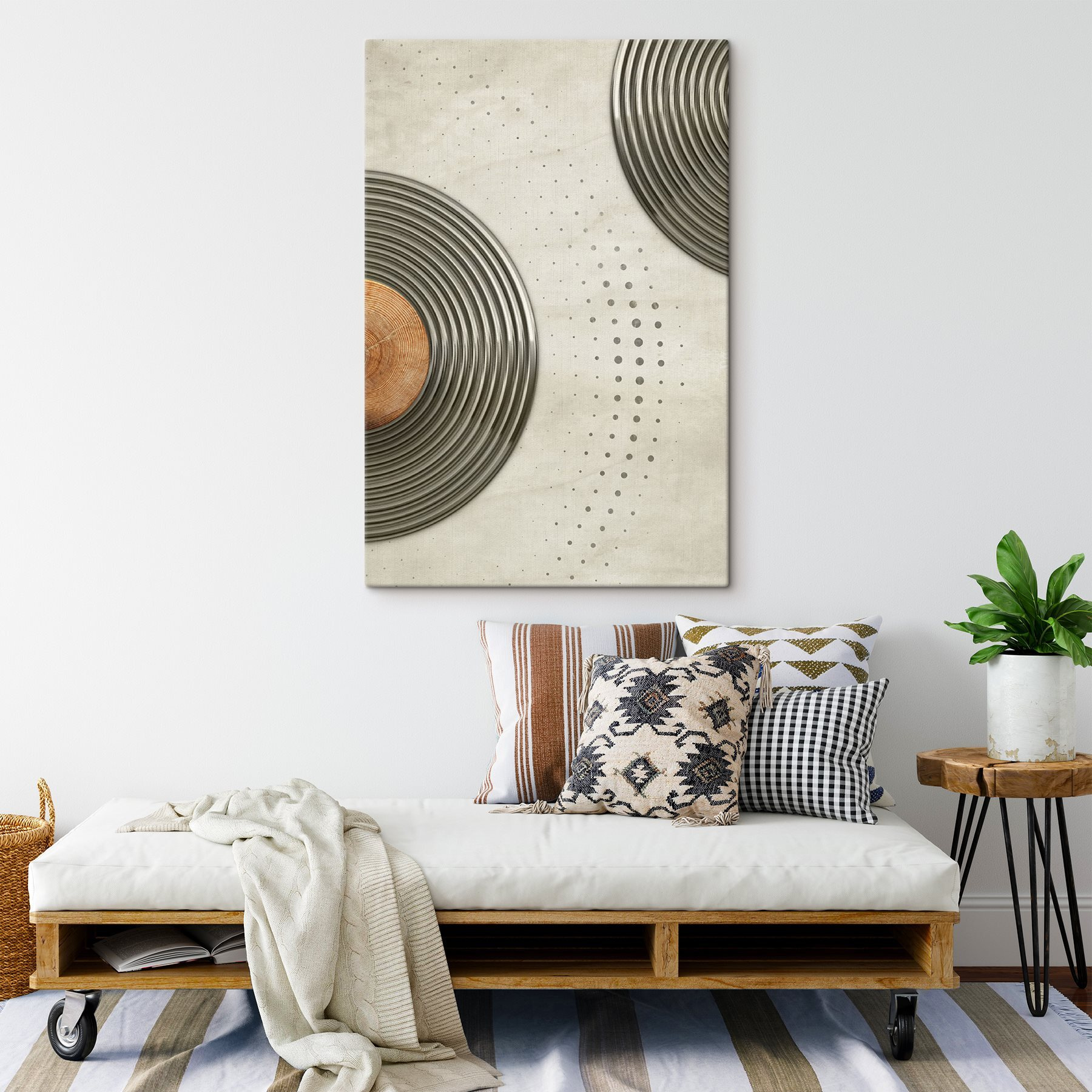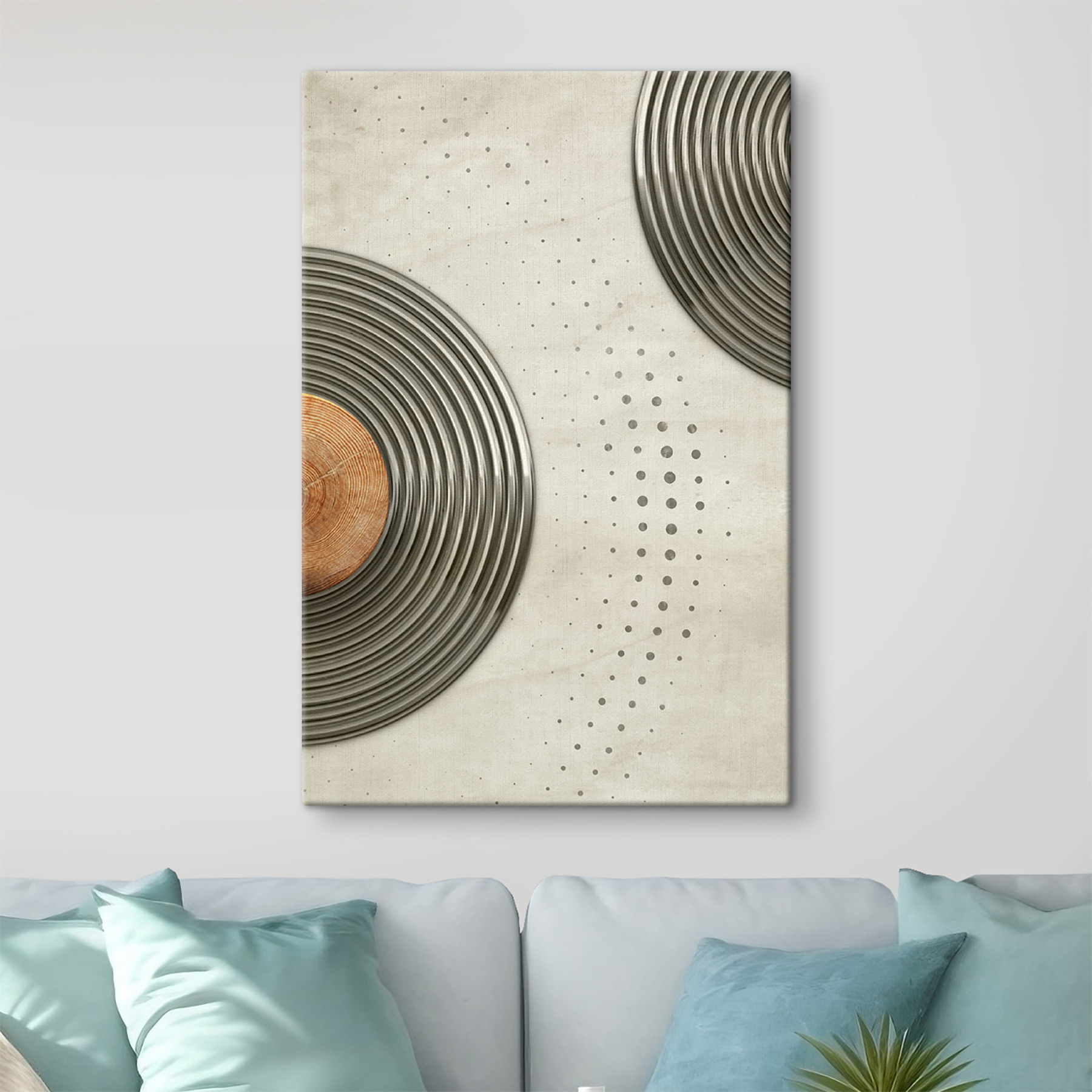 Transformați orice perete într-un subiect de conversație cu această imprimare pe pânză cu un design circular dinamic. Este ca o petrecere de dans pentru peretele dvs. – vârtejuri fără sfârșit și modele jucăușe care atrag atenția! Imaginați-vă-o într-un loft confortabil sau într-o cafenea la modă; cu siguranță va stârni bucurie și inspirație. Tonurile subtile sunt ușoare pentru ochi, ceea ce îl face fundalul perfect pentru ritualul cafelei de dimineață sau pentru o întâlnire distractivă cu prietenii. Cui nu i-ar plăcea o piesă care pare modernă și primitoare în același timp? Este arta care șoptește, “stai puțin”.