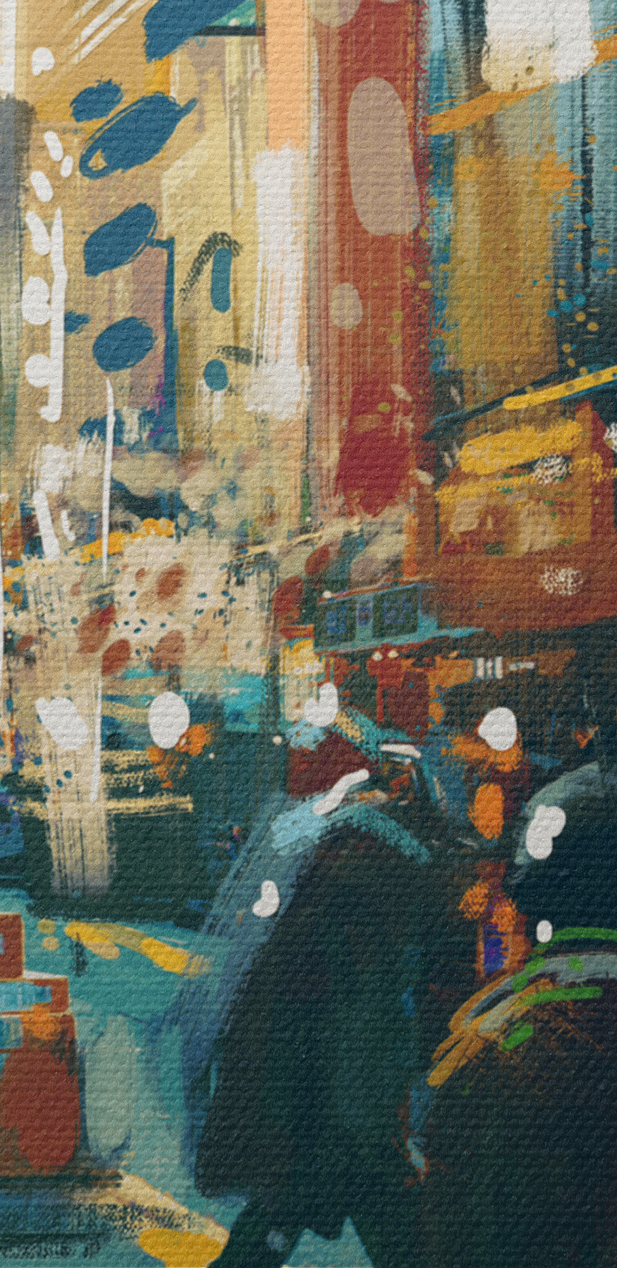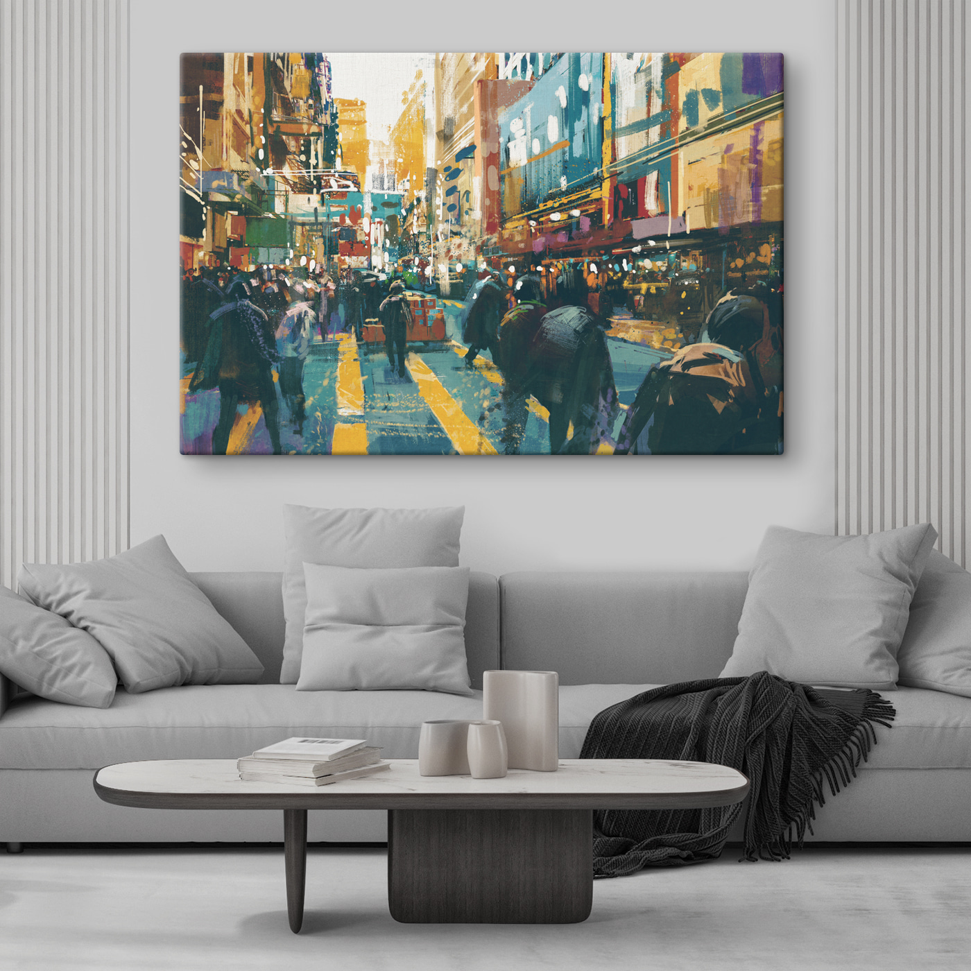 Pășiți în energia plină de viață a orașului cu acest print pe pânză vibrant. Imaginați-vă o stradă plină de viață, unde se plimbă un grup divers de oameni, fiecare cu propria poveste și destinație. Arhitectura colorată îi înconjoară ca un fundal plin de viață, făcând din fiecare privire o aventură. Este ca și cum ai captura un instantaneu al unui moment spontan, insuflând spațiului tău un sentiment de mișcare și entuziasm. Imaginați-vă că agățați acest tablou într-un colț confortabil – perfect pentru a stârni conversații sau pur și simplu pentru a visa cu ochii deschiși la următoarea escapadă urbană. Aduceți pulsul orașului în interior!
