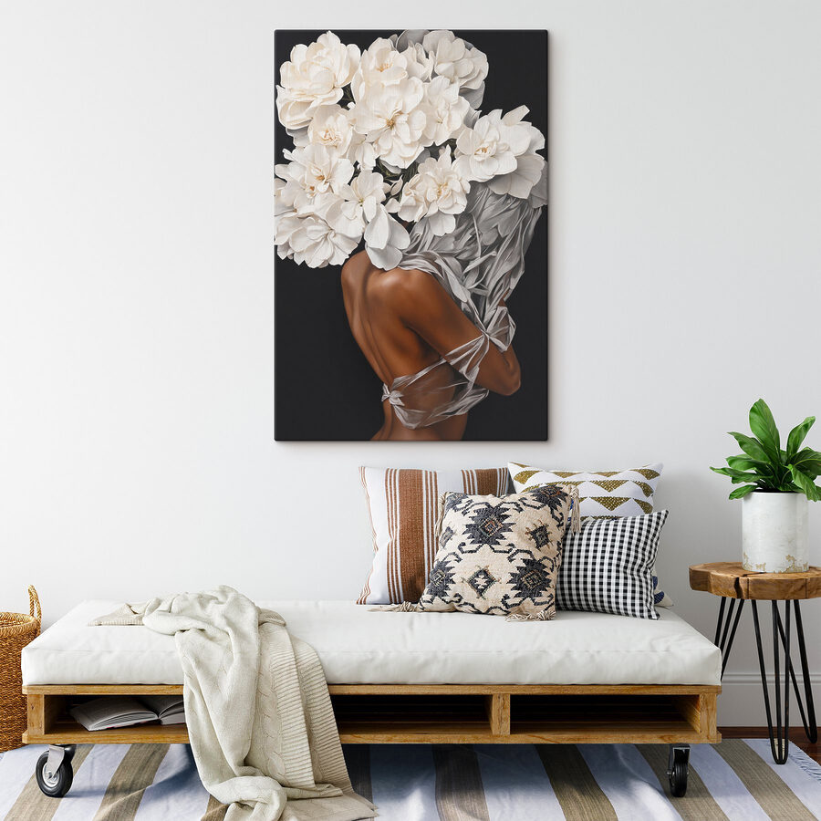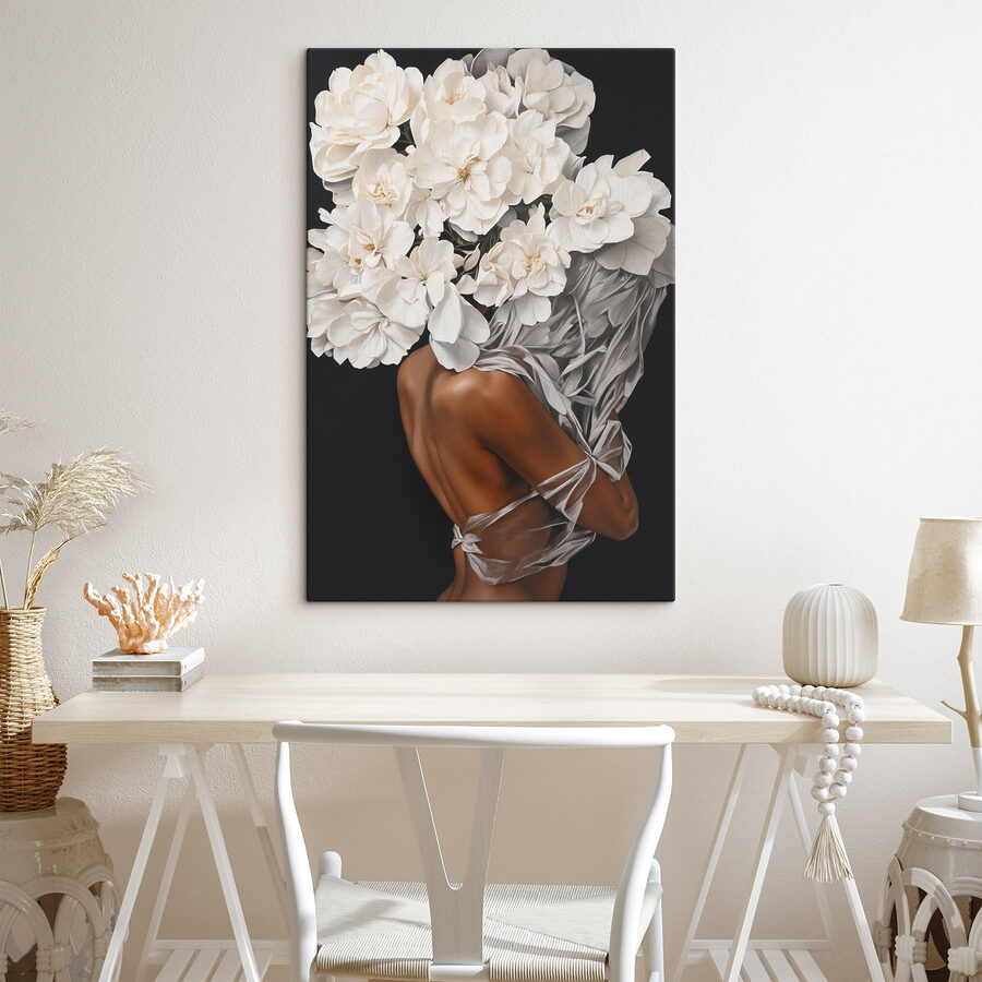 Imaginați-vă că intrați în sufragerie după o zi lungă și vedeți asta pe perete – calmant instantaneu, nu? “Blossoms in graceful embrace” este mai mult decât o simplă imprimare pe pânză. Această piesă de artă combină frumusețea delicată a florilor alb-crem cu eleganța subtilă a unei figuri înfășurate într-o draperie transparentă. Este ca o șoaptă de primăvară, care înmoaie fără efort orice cameră. Prietenii care vă vizitează vor începe probabil imediat să își planifice propria artă murală florală. Adăugați-o în spațiul dvs. pentru o notă de grație și un pic de “factor wow” care nu va da greș niciodată în a impresiona.