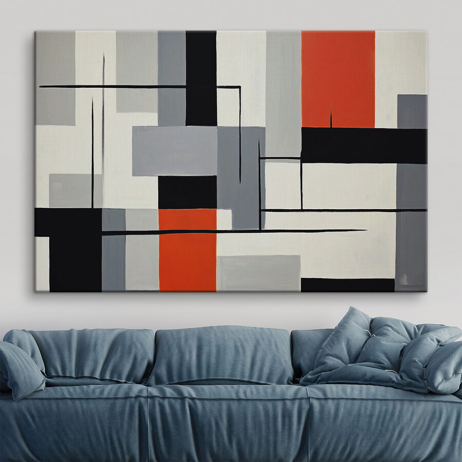 Imaginează-ți această piesă agățată în spațiul tău. Este ca și cum ar avea o poveste de spus, cu acel dreptunghi roșu îndrăzneț care fură lumina reflectoarelor în mijlocul întregii scări de gri și negru. Nu este vorba doar despre umplerea unui perete gol; este un starter de conversație. S-ar putea să vă treziți uitându-vă la el atunci când vă gândiți profund sau când vă relaxați după o zi lungă.