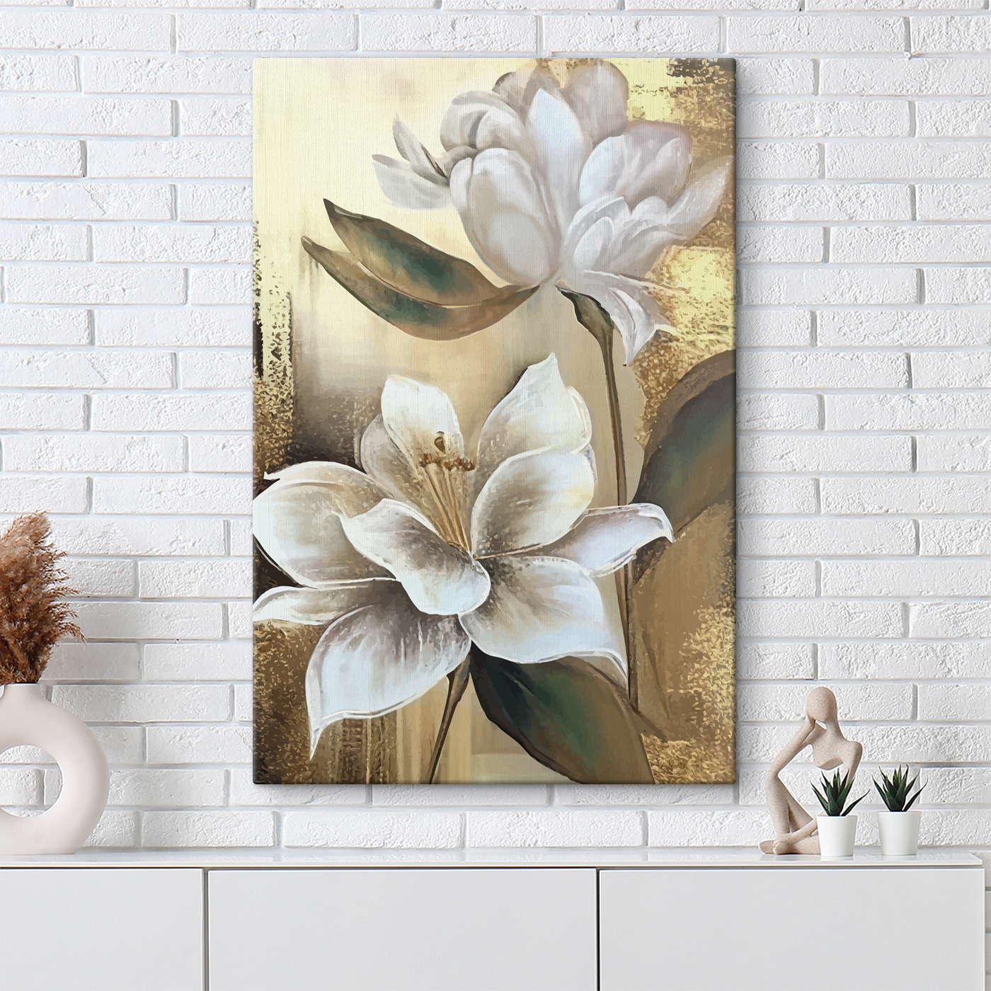 Înveseliți orice cameră cu această imprimare uimitoare pe pânză, care prezintă flori albe delicate asociate cu frunze verzi minunate. Imaginați-vă aceste flori vibrante care vă împodobesc peretele, aducând un strop de natură în interior. Perfectă pentru spațiile confortabile sau pentru acele colțuri senine care au nevoie de puțină dragoste, această operă de artă șoptește eleganță fără a strigă după atenție. Imaginați-vă-o într-un loc însorit, aruncând umbre blânde și îndulcind atmosfera. Este ca și cum ai avea o felie de primăvară pe tot parcursul anului. O atingere perfectă pentru oricine dorește să creeze o atmosferă calmă și primitoare!