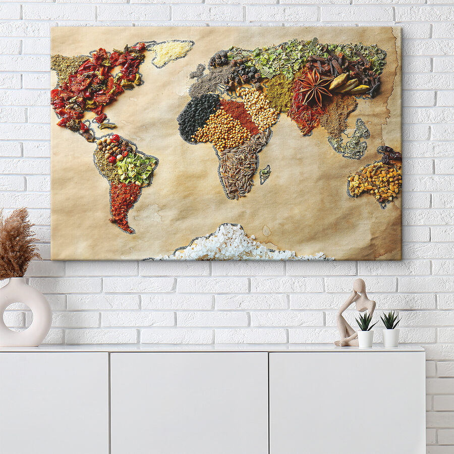 Hei, pasionați de decorațiuni! Aruncați o privire la acest tablou impresionant, “Harta lumii făcută din condimente”. Vorbim despre un starter de conversație! Imaginați-vă acest lucru agățat în bucătăria sau sufrageria dvs. – este ca o aventură culinară globală de fiecare dată când vă uitați la el. Fiecare continent este alcătuit din mirodenii, texturi și culori diferite. Te face să te întrebi cum miroase și ce gust are fiecare condiment, nu-i așa?