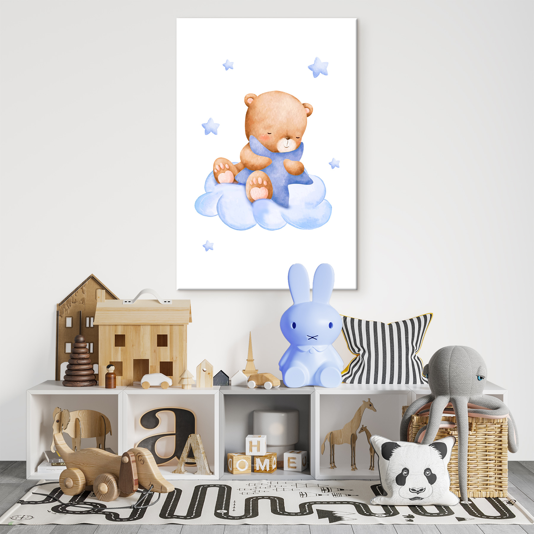 Oh, nu este acesta cel mai dulce lucru mic? Imaginați-vă această pânză fermecătoare agățată în camera unui copil, stârnind tot felul de vise capricioase. Imaginați-vă un ursuleț de pluș, care ațipește ușor pe un nor moale și pufos, înfășurat într-o îmbrățișare confortabilă cu o stea albastră sclipitoare.