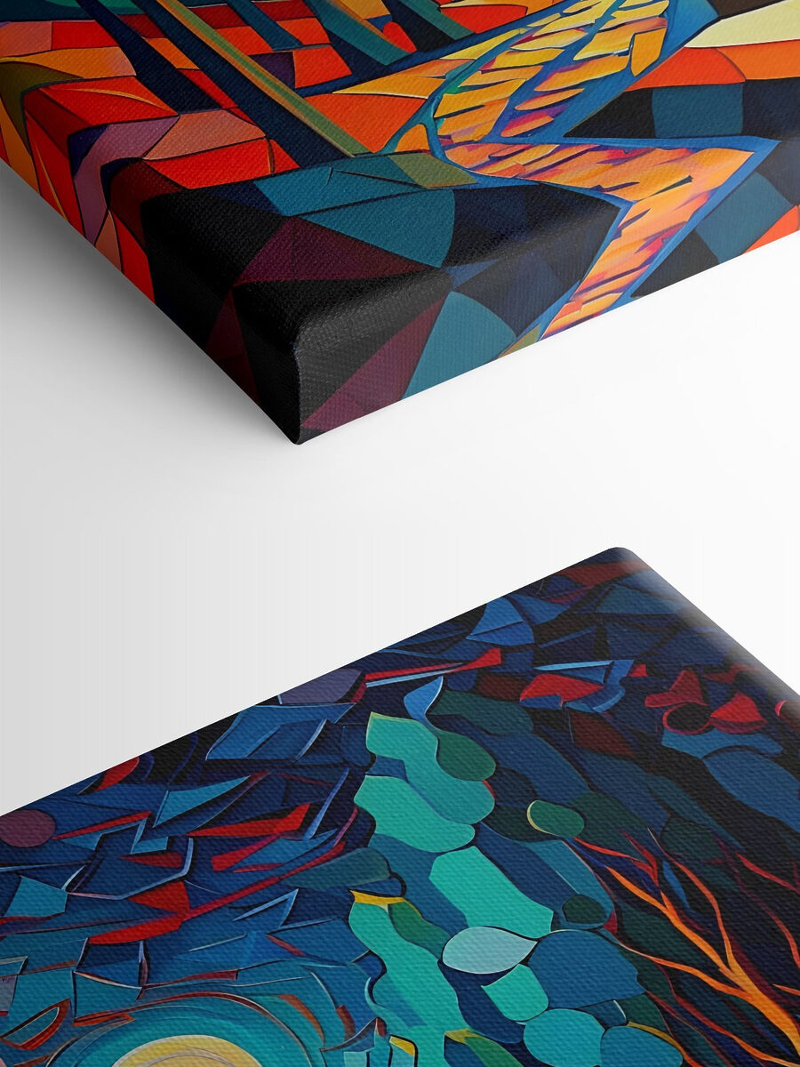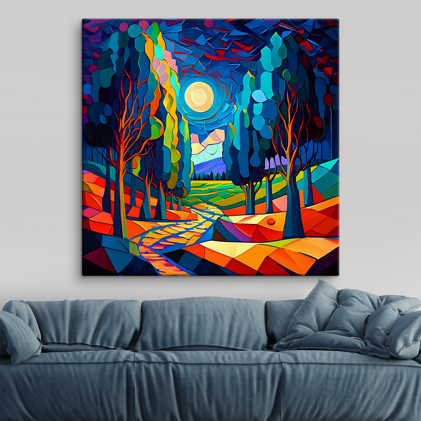 Imaginați-vă că veniți acasă cu acest “Peisaj colorat cu copaci și o cărare” pe perete – este ca și cum ați intra direct într-un vis vesel. Culorile vibrante și designul capricios fac imposibil să nu zâmbești. Albastrul îndrăzneț și verdele strălucitor, cu stropi de portocaliu aprins, descriu o potecă fermecătoare. Este ca și cum copacii ar avea secrete, iar această cărare? Este călătoria ta. Perfectă pentru o cameră care are nevoie de un strop de viață sau de un imbold spre aventură. Sfat pro: se potrivește de minune cu un colț de lectură confortabil sau cu o cameră de familie plină de viață. Este ceva magic – aproape că șoptește: “Vino, pierde-te în mine”.
