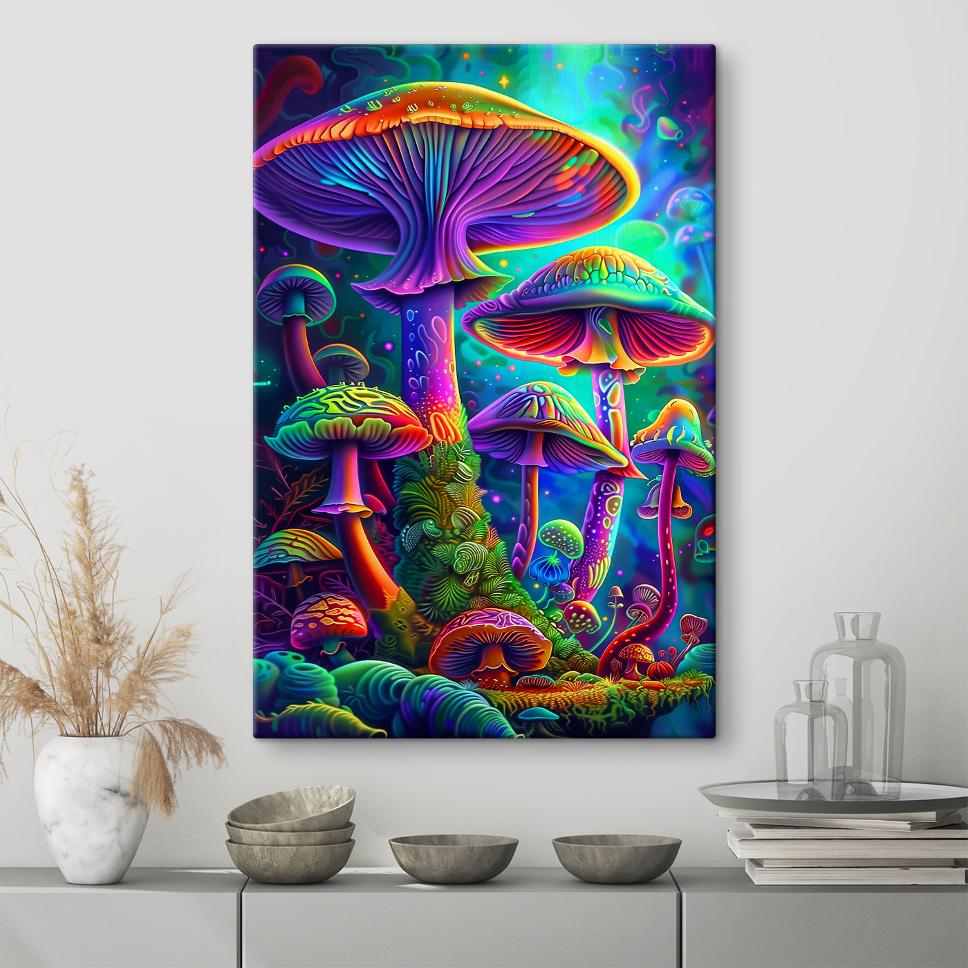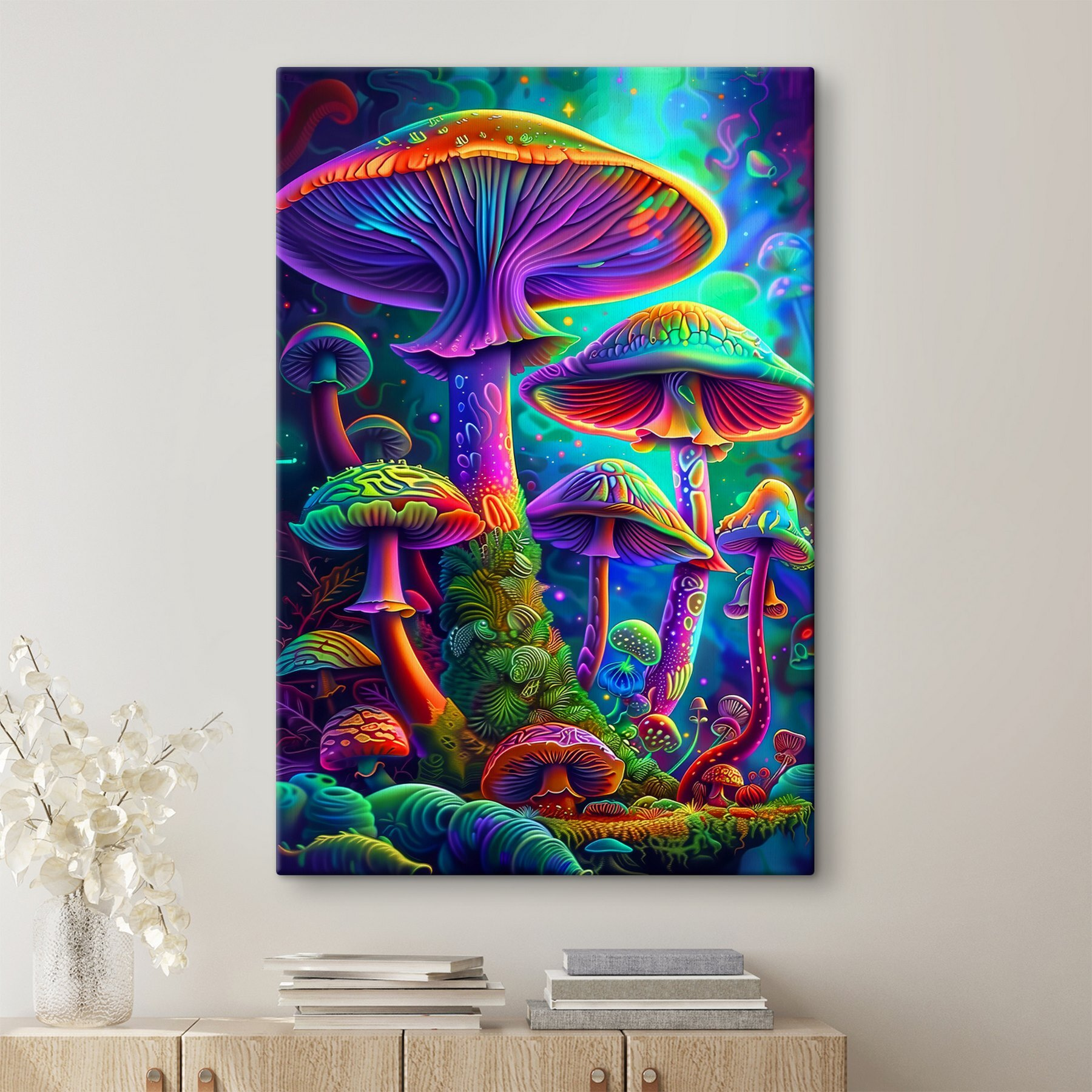 Cât de vibrante sunt aceste ciuperci, nu-i așa? Este ca și cum ai păși într-o pădure fermecată, capricioasă, de fiecare dată când arunci o privire la “Tablouri Group of Colorful Mushrooms”. Perfect pentru oricine iubește o explozie de culoare sau are nevoie de puțină veselie în spațiul său. Imaginați-vă acest lucru – vă sorbiți cafeaua de dimineață și iată-le, aceste ciuperci vesele, în culorile curcubeului. Luminează întreaga cameră și starea ta de spirit. Un astfel de amestec fantastic de natură și imaginație. Ar arăta uimitor într-o cameră de zi, într-un colț de lectură confortabil sau chiar într-un birou excentric. De fiecare dată când cineva o vede, va zâmbi. Cu siguranță un material care stârnește conversații! 🌈🍄