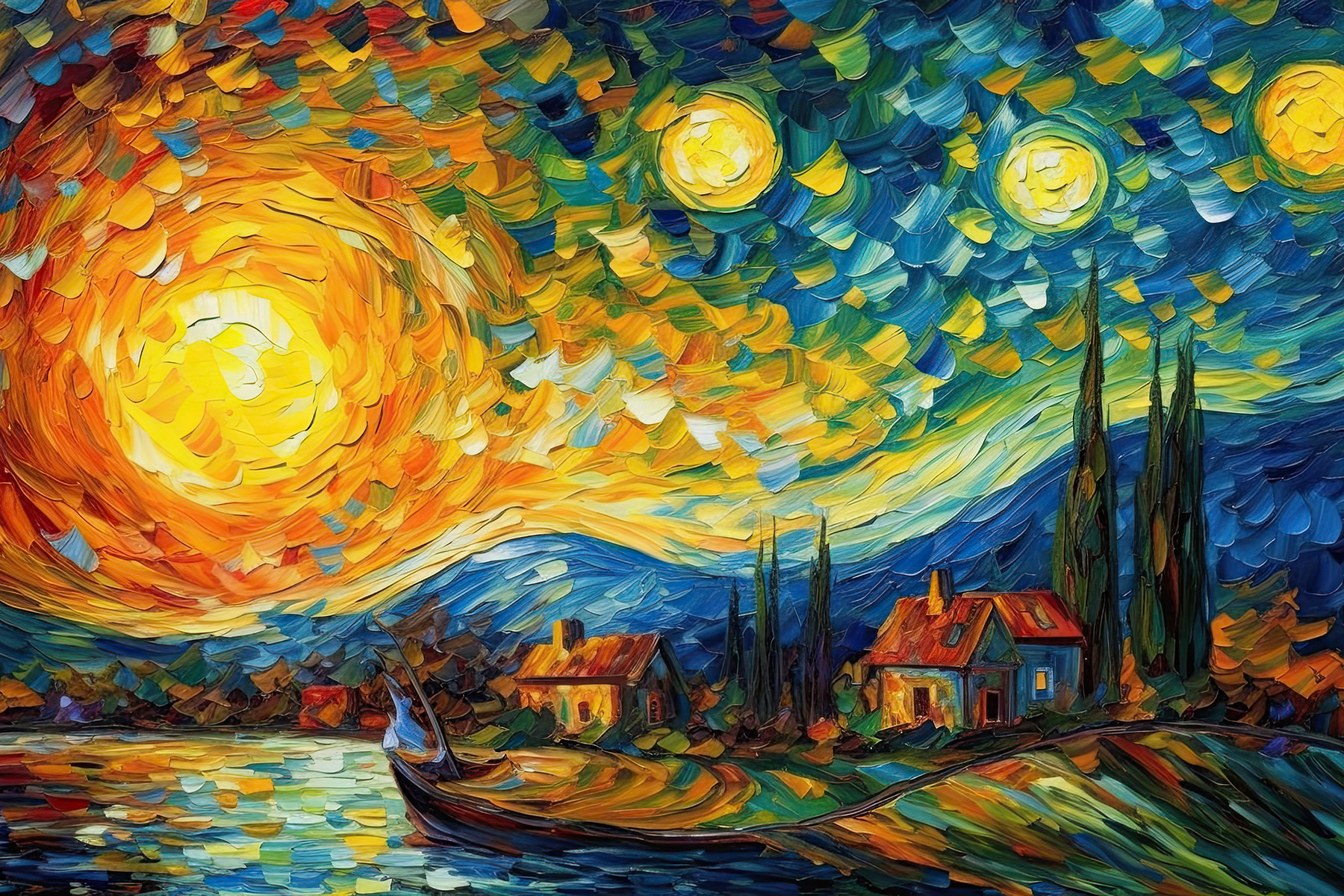 Imaginați-vă asta pe peretele dvs. – este ca un vârtej de culori care dansează deasupra unui sat confortabil. “Vibrant swirling sky over village” vă transformă spațiul într-un peisaj de vis plin de viață. Aceste vârtejuri de albastru intens, portocaliu aprins și galben vesel? Aproape că par că se mișcă. Imaginați-vă sorbind un ceai, lăsându-vă ochii să se plimbe printre operele de artă – este ca și cum v-ați afla în două locuri în același timp: casa dvs. și un sat cu o noapte înstelată. Acest print nu este doar un decor, ci și un subiect de conversație. Prieteni în vizită? Vor fi hipnotizați. Perfect pentru oricine dorește un strop de fantezie și căldură în privirea sa de zi cu zi.