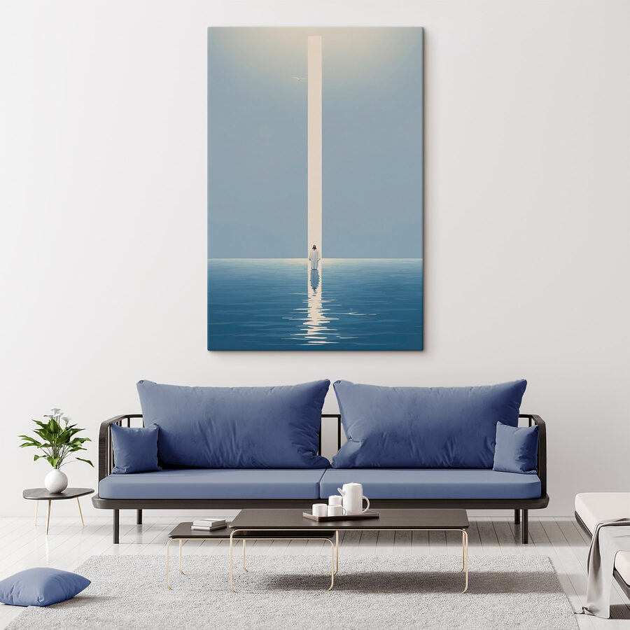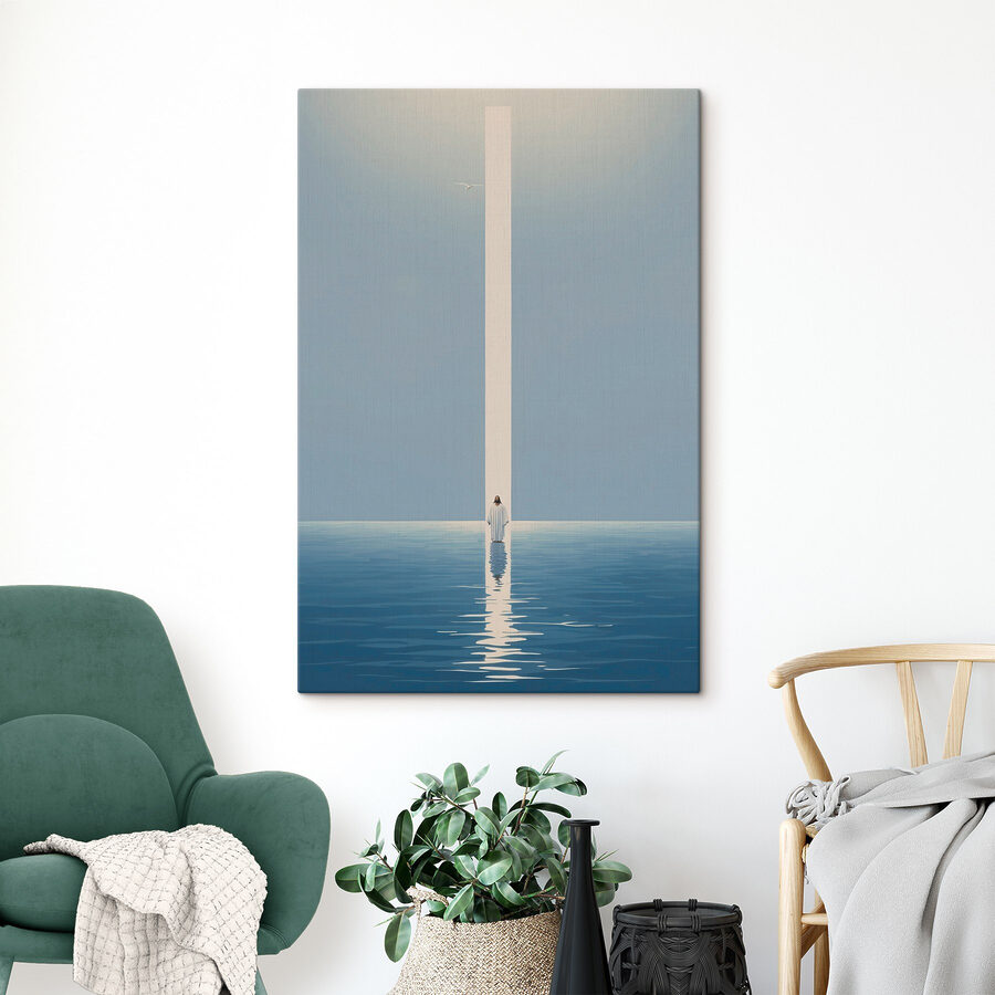 Pășiți în liniște cu această imprimare pe pânză care prezintă o figură senină într-un halat alb, în picioare, în mijlocul apelor calme. Este ca o mică bucată de pace chiar pe peretele tău. Imaginați-vă acest lucru: soarele abia se zărește la orizont, o licărire moale dansează în apă și o briză ușoară șoptește prin cameră. Aduce un sentiment de calm și reflecție – perfect pentru acele momente când viața devine un pic prea zgomotoasă. Această operă de artă nu doar decorează; vă invită să faceți o pauză, să respirați și poate chiar să găsiți puțină claritate în haos. Gândiți-vă la ea ca la un memento zilnic că seninătatea este întotdeauna la îndemână.