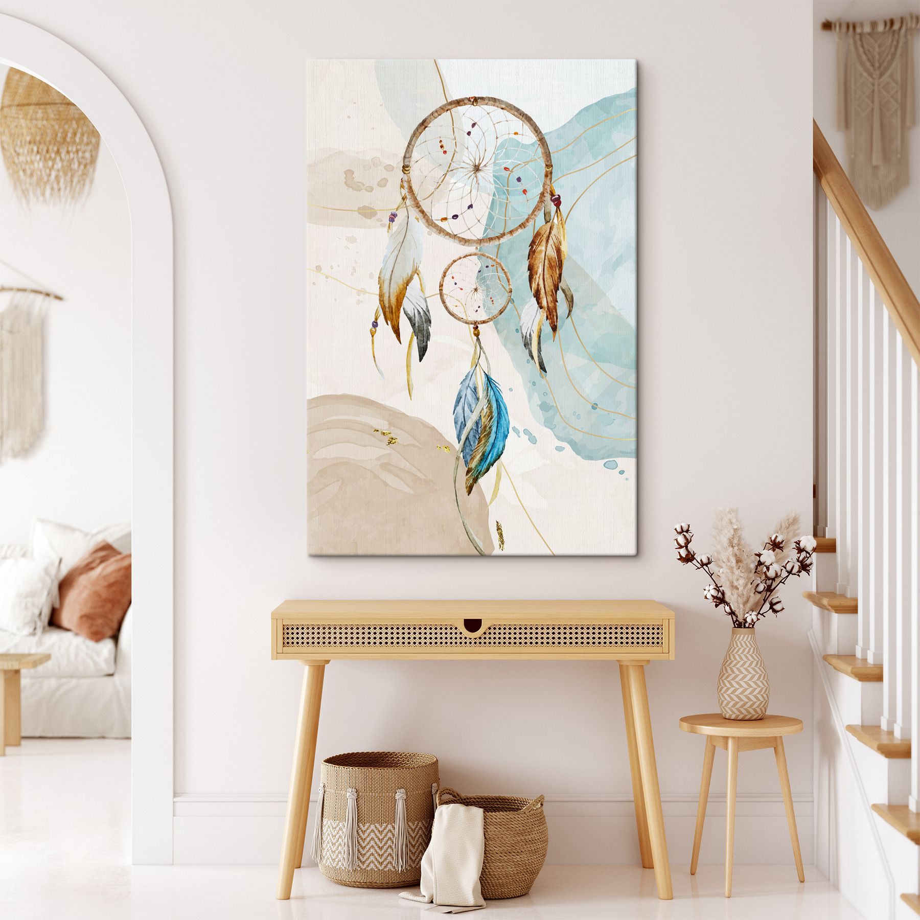 Transformați-vă spațiul într-un refugiu confortabil cu această imprimare încântătoare pe pânză a unui prinzător de vise. Imaginați-vă-l atârnat fără efort pe perete, invitând vibrații bune și vise dulci, adăugând în același timp un strop de farmec boem. Designul acuarelă dansează cu nuanțe blânde, iar penele delicate par aproape gata să zboare într-o briză ușoară. Imaginează-ți cum te relaxezi pe canapea cu o băutură caldă, privind această operă de artă, simțind cum se ridică greutatea grijilor. Nu este doar un decor; este o bucățică de seninătate care șoptește: “Relaxează-te, te descurci”. Perfectă pentru sufragerii sau dormitoare, este ca o îmbrățișare blândă pentru casa ta.