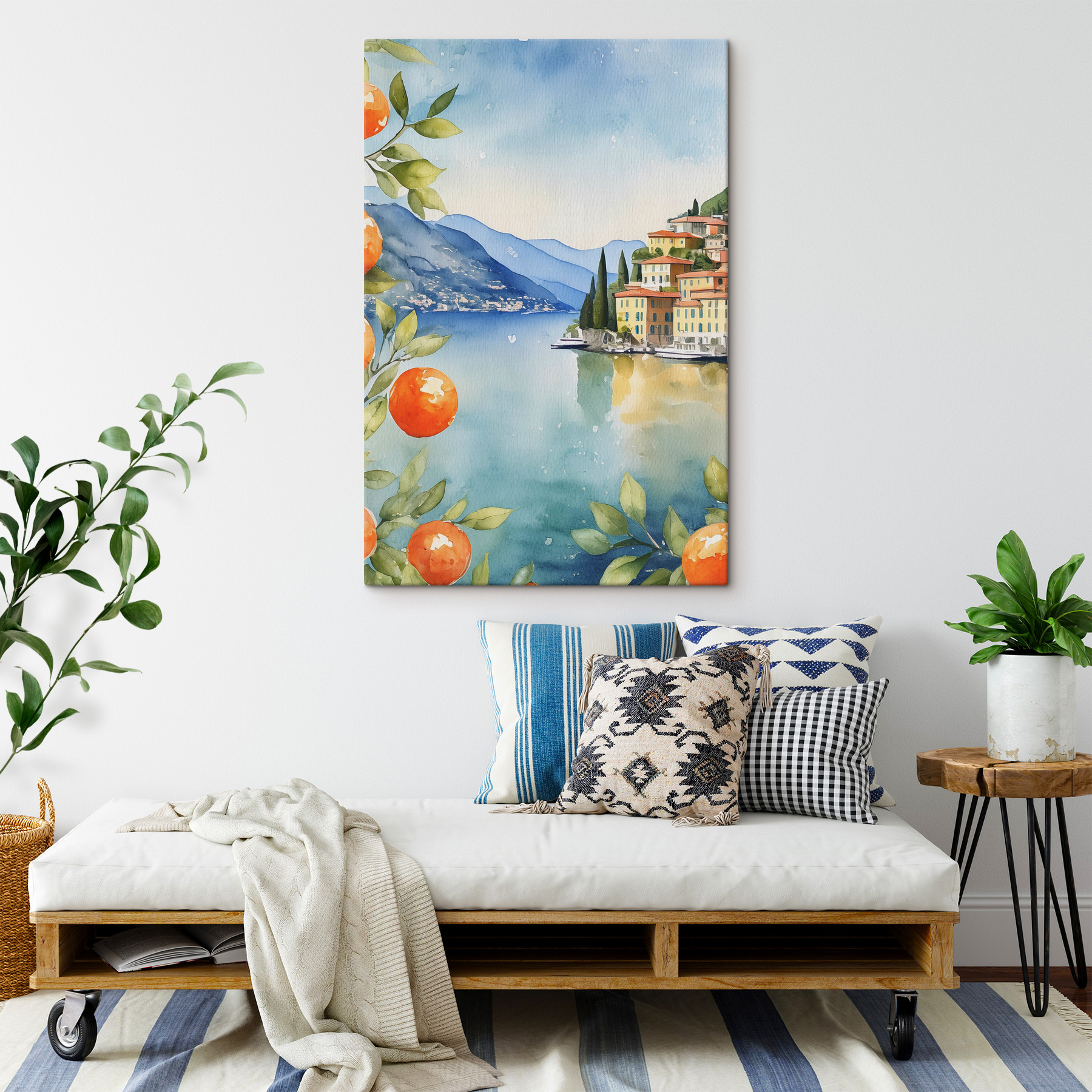 Această imprimare pe pânză vibrantă, “Satul de pe malul lacului cu portocali”, vă transportă instantaneu într-un loc calm, răcoritor. Imaginați-vă acest lucru: este ca și cum ați privi o scenă de vis în acuarelă, în care portocalele vibrante și suculente se detașează de apele senine, în nuanțe de albastru. Imaginați-vă că vă treziți și vedeți această frumusețe în fiecare dimineață – vorbește despre un stimulent al dispoziției! Loviturile moi de pensulă și clădirile pitorești, colorate, care îmbrățișează țărmul par aproape universal liniștitoare. Este perfect pentru a adăuga un pic de fantezie și farmec inspirat din călătorii în orice cameră. Gândiți-vă la acele dimineți în care lumea pare haotică – o singură privire la această piesă și vă veți simți ca într-o retragere calmă, pe malul lacului. În plus, detaliul cu portocalele o face să pară aproape suficient de bună pentru a fi mâncată, adăugând o întorsătură jucăușă și neașteptată. O decorațiune de perete ideală pentru pasionații de călătorii, pentru cei care visează cu ochii deschiși sau pentru oricine dorește să insufle spațiului său o notă de liniște proaspătă, colorată.