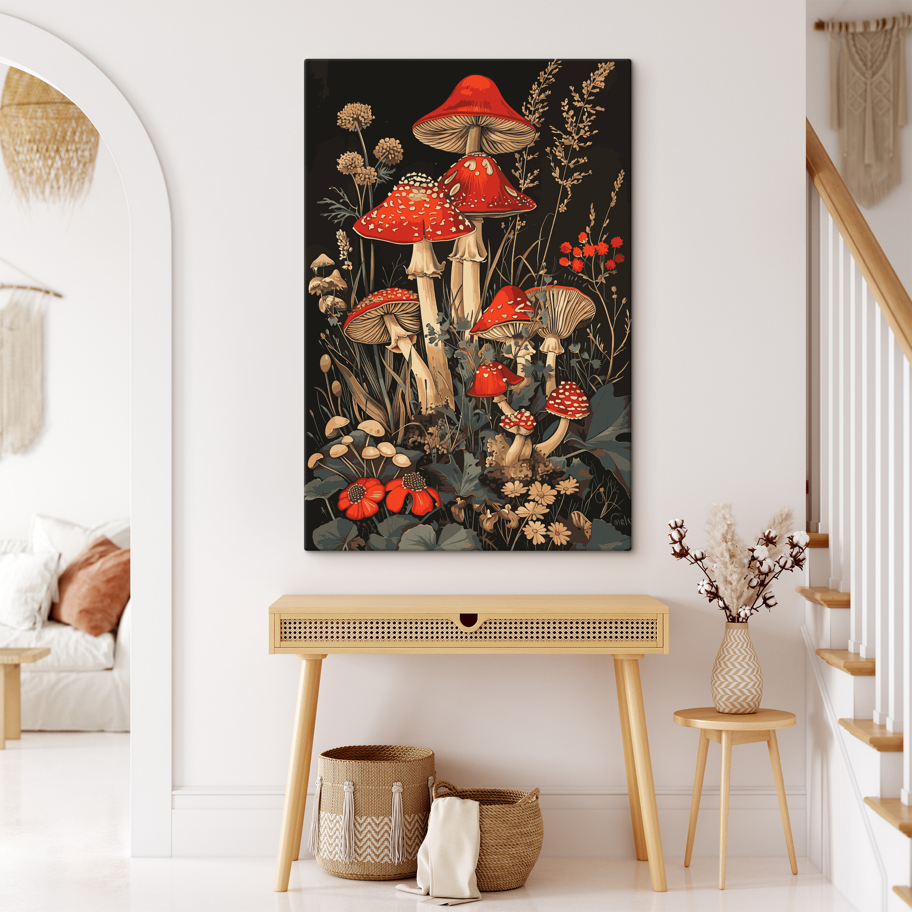 Imaginați-vă că adăugați un strop de magie a pădurii în casa dvs. cu această imprimare fermecătoare pe pânză a ciupercilor cu cap roșu, cuibărită într-un decor floral. Perfectă pentru iubitorii de natură și pentru cei cu o inimă capricioasă, această piesă captează vibrațiile ciudate și confortabile ale unei păduri fermecate. Nu vi-l puteți imagina înviorând colțul bucătăriei sau colțul de lectură? Tonurile bogate, pământii și exploziile vibrante de roșu vă fac să vă simțiți ca și cum ați fi dat peste o grădină secretă. Lăsați această operă de artă să aducă o notă de minune de basm în viața dvs. de zi cu zi!