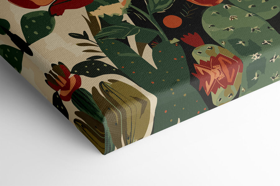 Ați văzut vreodată artă care pur și simplu vă transpune? Este exact ceea ce face “Floral Vibes Among Prickly Cacti”. Acest print pe pânză are un amestec unic de cactuși îndrăzneți și flori vibrante, toate împletite în jurul unei figuri izbitoare. Imaginează-ți acest tablou în sufrageria ta – de fiecare dată când arunci o privire peste el, este ca o mini evadare într-o oază caldă din deșert. Amestecul de culori este în același timp calmant și energizant, ca o ceașcă bună de cafea. Perfect pentru a adăuga acea notă de natură și artă, dar fără a fi nevoit să te ocupi de verdeață. Agățați-o și lăsați-o să vorbească de la sine. Este jucăuș, este frumos – este un starter de conversație. Prietenii vor întreba cu siguranță despre ea!