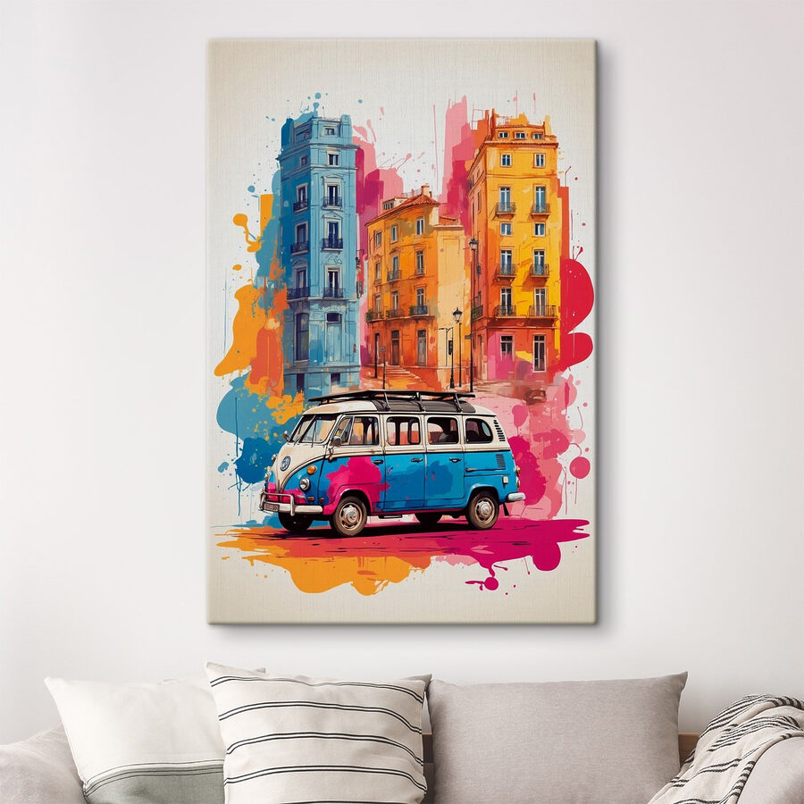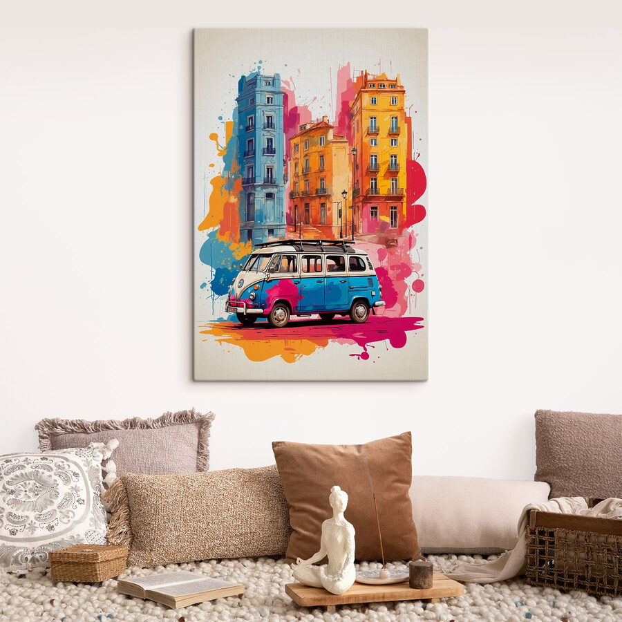 Imaginează-ți asta: stai în sufrageria ta confortabilă, sorbindu-ți cafeaua de dimineață, și bam! Pe perete apare o pânză vibrantă – bucățele de culoare de la o dubiță plină de viață și un peisaj urban strălucitor. Este ca și cum clădirile au decis că au nevoie de o petrecere și nu s-au abținut. Perfect pentru oricine iubește o pată bună de caracter în decorul său. Este o piesă care strigă creativitate, aproape provocându-vă să faceți o excursie sau poate doar să vă gândiți la cât de distractivă poate fi viața. Ar face chiar și diminețile de luni să se simtă ca o aventură.