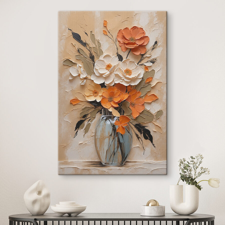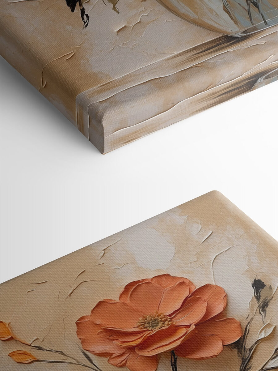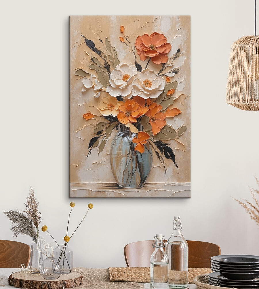 Imaginați-vă că intrați în camera dvs. de zi și sunteți întâmpinați de o explozie de culoare la fel de răcoritoare ca o dimineață de primăvară. Această “Pictură pe pânză cu flori într-o vază” nu este doar o operă de artă – este o personalitate care așteaptă să vă înveselească spațiul. Portocaliul îndrăzneț și albul blând se îmbină ca vechi prieteni, oferind atât căldură, cât și eleganță. Imaginați-vă acest lucru: într-o zi de luni mohorâtă, vă sorbiți cafeaua, aruncați o privire furișă la această capodoperă și iată – starea de spirit se ridică instantaneu. Este ca un buchet care nu se ofilește niciodată, încurajându-ți mereu starea de bine. Perfect pentru orice perete care tânjește după un pic de bucurie în plus.