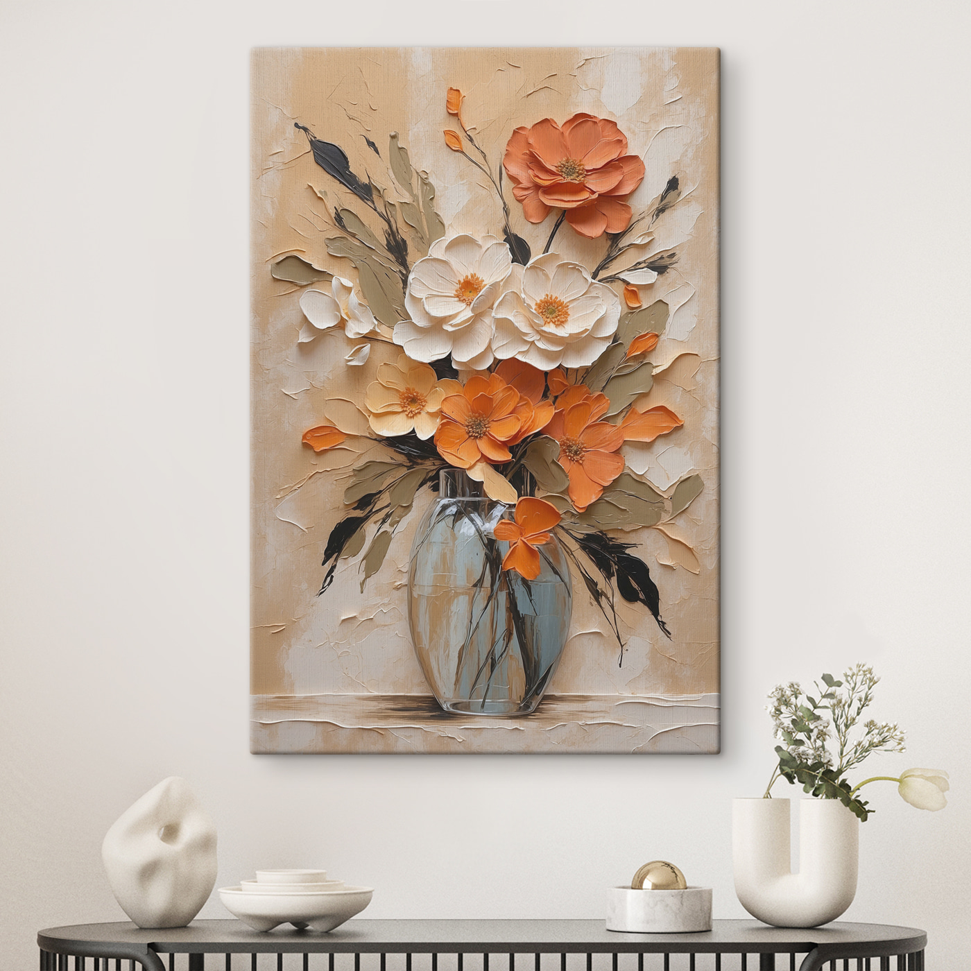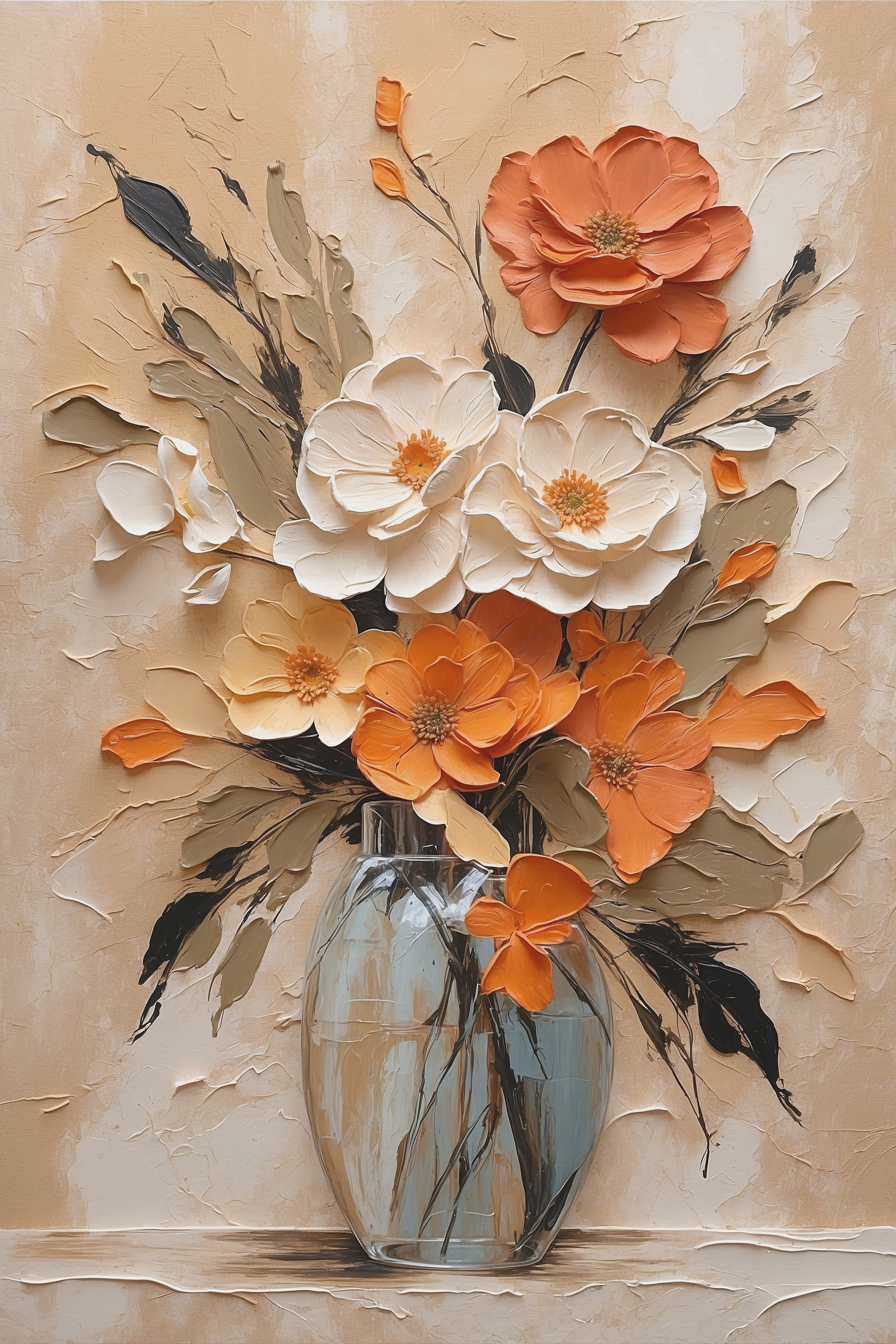 Imaginați-vă că intrați în camera dvs. de zi și sunteți întâmpinați de o explozie de culoare la fel de răcoritoare ca o dimineață de primăvară. Această “Pictură pe pânză cu flori într-o vază” nu este doar o operă de artă – este o personalitate care așteaptă să vă înveselească spațiul. Portocaliul îndrăzneț și albul blând se îmbină ca vechi prieteni, oferind atât căldură, cât și eleganță. Imaginați-vă acest lucru: într-o zi de luni mohorâtă, vă sorbiți cafeaua, aruncați o privire furișă la această capodoperă și iată – starea de spirit se ridică instantaneu. Este ca un buchet care nu se ofilește niciodată, încurajându-ți mereu starea de bine. Perfect pentru orice perete care tânjește după un pic de bucurie în plus.