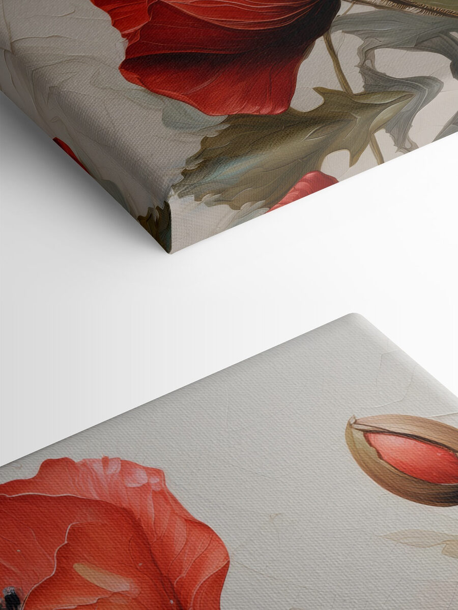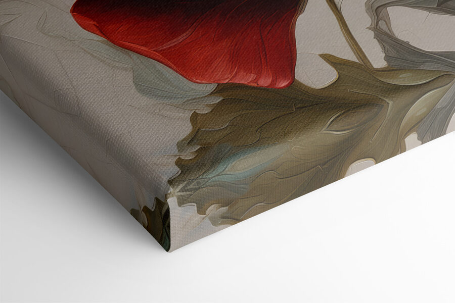 Florile roșii strălucitoare, în floare elegantă, aduc instantaneu un strop de energie vibrantă în orice spațiu. Imaginați-vă că intrați într-o cameră în care aceste frumuseți vă întâmpină, petalele lor aproape fluturând de viață. Ele emană căldură, ca o zi însorită învăluită într-o atmosferă confortabilă de după-amiază. Perfectă pentru o cameră de zi sau o bucătărie veselă, această pânză este ca o gură de aer proaspăt. Este acea mică piesă care șoptește: “Simte-te ca acasă”. Prietenii ar putea chiar să o confunde cu o grădină – doar că fără polen! Lăsați această operă de artă să devină subiect de conversație așa cum merită să fie.