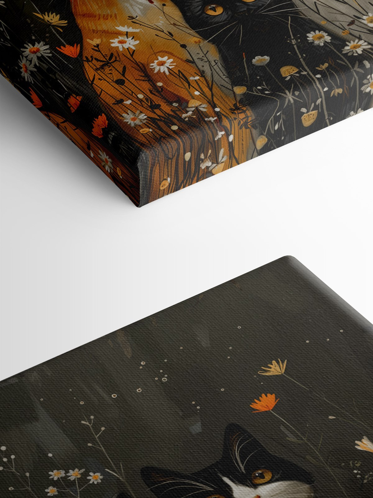 Imaginați-vă asta: un grup încântător de pisici stând frumos într-un câmp de flori vibrante. Este exact genul de scenă care poate înveseli ziua oricui. Fiecare felină pare să aibă propria sa personalitate, de la privirile curioase la acele posturi regale pe care numai pisicile par să le adopte fără efort. Această imprimare pe pânză nu decorează doar un perete, ci adaugă un strop de fantezie și căldură oricărui spațiu. Imaginați-vă un colț de lectură confortabil sau o bucătărie însorită în care acești prieteni blănoși vă țin companie. Este ca și cum ai avea un pic din farmecul naturii în interior. Perfect pentru iubitorii de pisici sau pentru oricine caută o notă de bucurie în decorul său – pentru că cine nu și-ar dori o gașcă de pisici elegante care să vegheze asupra sa?