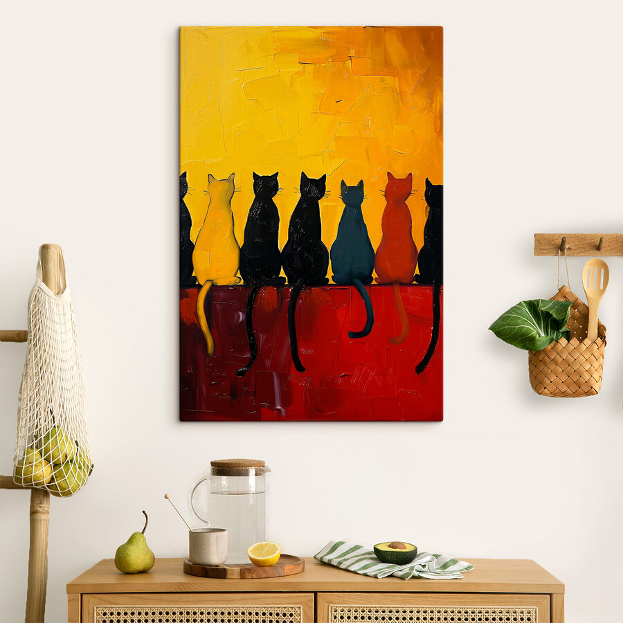 Priviți această imprimare pe pânză excentrică intitulată “Tablouri s39309” – este ca o paradă de pisici care se relaxează într-o după-amiază leneșă! Galbenul aprins și roșul bogat se amestecă, emițând o vibrație îndrăzneață și jucăușă. Fiecare pisică pare să aibă propria sa personalitate, nu-i așa? Această piesă ar fi perfectă pentru orice loc care ar avea nevoie de un strop de fantezie și o explozie de culoare. Imaginați-vă-o într-un colț de lectură confortabil sau poate deasupra canapelei – cu siguranță va stârni conversații și câteva zâmbete. Cine ar fi crezut că pisicile pot fi atât de sofisticate și distractive în același timp? Haideți și dați pereților dvs. un caracter plin de viață cu această aliniere de pisici fermecătoare!