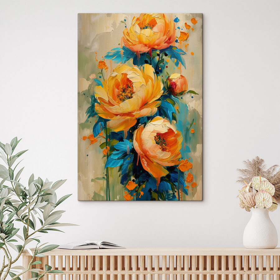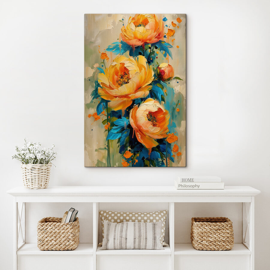 Înveselește-ți spațiul cu această imprimare pe pânză vibrantă cu flori frumoase care par că tocmai au izbucnit la viață. Explozia de culori – galben moale, portocaliu vesel și verde răcoritor – atrage privirea și face ca orice cameră să se simtă caldă și primitoare. Imaginați-vă că vă sorbiți cafeaua de dimineață, vă uitați la această operă de artă și brusc vă simțiți ca într-o grădină însorită în loc de bucătărie. Este ca o mică bucată de natură chiar pe peretele tău! Perfectă pentru dormitoare, camere de zi sau oriunde ar fi nevoie de un strop de bucurie. Lasă-l să vorbească despre dragostea ta pentru un decor unic!