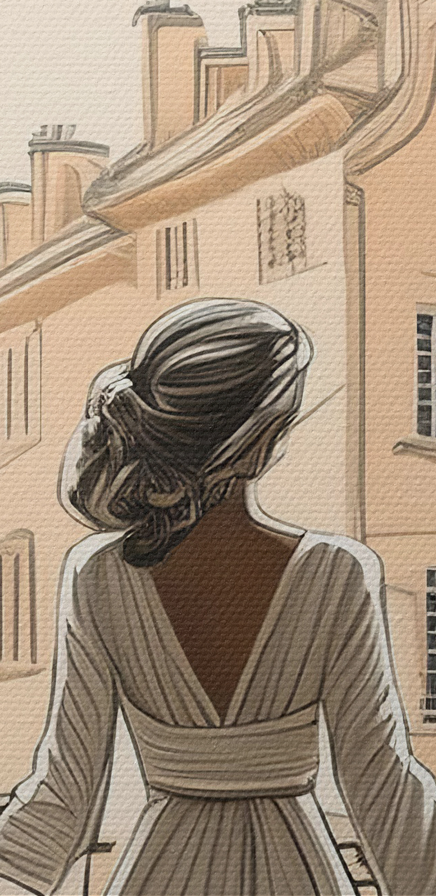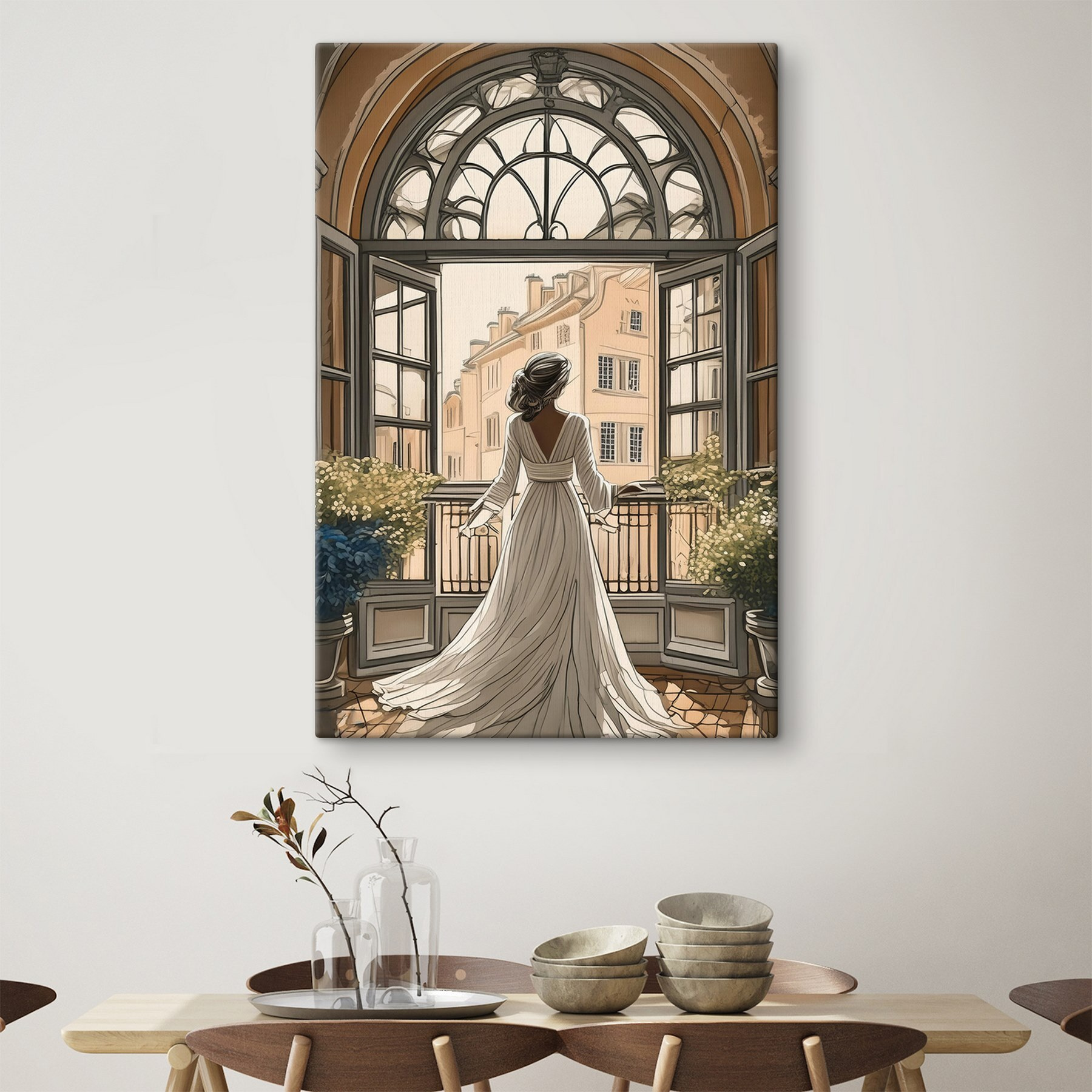 Ați visat vreodată să pășiți într-un moment atemporal de frumusețe și eleganță? Această imprimare pe pânză, numită “Tablouri s39480”, surprinde exact acest lucru. Imaginați-vă acest lucru – o femeie, drapată elegant într-o rochie vaporoasă, privind dinspre o fereastră grandioasă arcuită. Peisajul urban de afară, cu clădirile sale fermecătoare, șoptește povești de romantism și nostalgie. Nuanțele blânde și detaliile complicate te fac să te simți ca și cum ai fi chiar acolo cu ea, poate într-o dimineață leneșă de duminică, absorbind acel vibe senin.