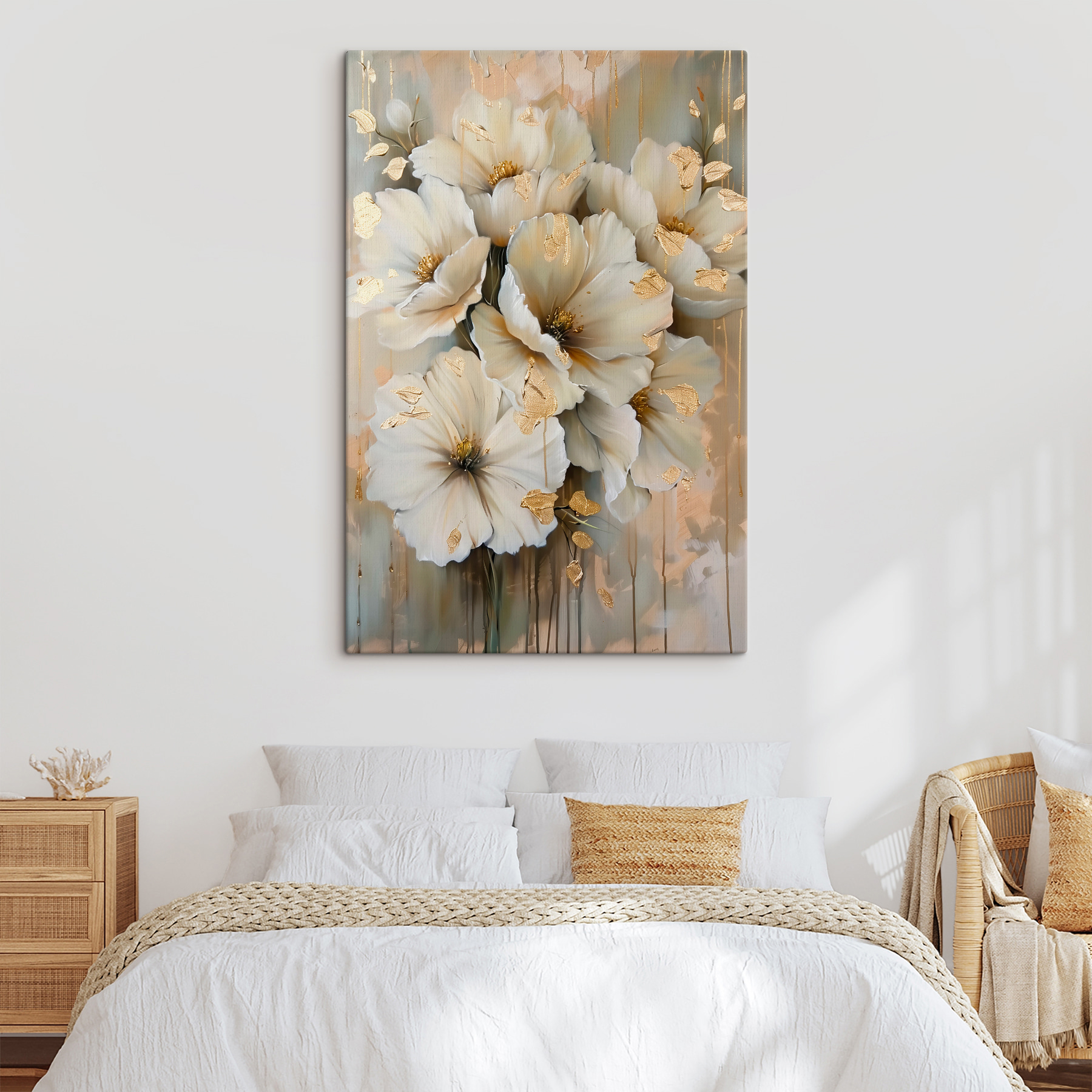 Pășiți într-o lume a eleganței cu această imprimare uimitoare pe pânză cu flori de vis. Este ca o lumină blândă de dimineață care se revarsă în spațiul tău, invitând la căldură și seninătate. Imaginați-vă-o agățată deasupra unei canapele confortabile, transformând fiecare întâlnire ocazională într-o ocazie specială. Culorile blânde și detaliile complicate atrag privirea fără a strigă după atenție. Este acea piesă perfectă care adaugă caracter unei încăperi, stârnind conversații despre grădini și frumusețea naturii. Imaginați-vă sorbind ceai în timp ce savurați frumusețea acestor flori. Pur și simplu vă simțiți ca acasă.