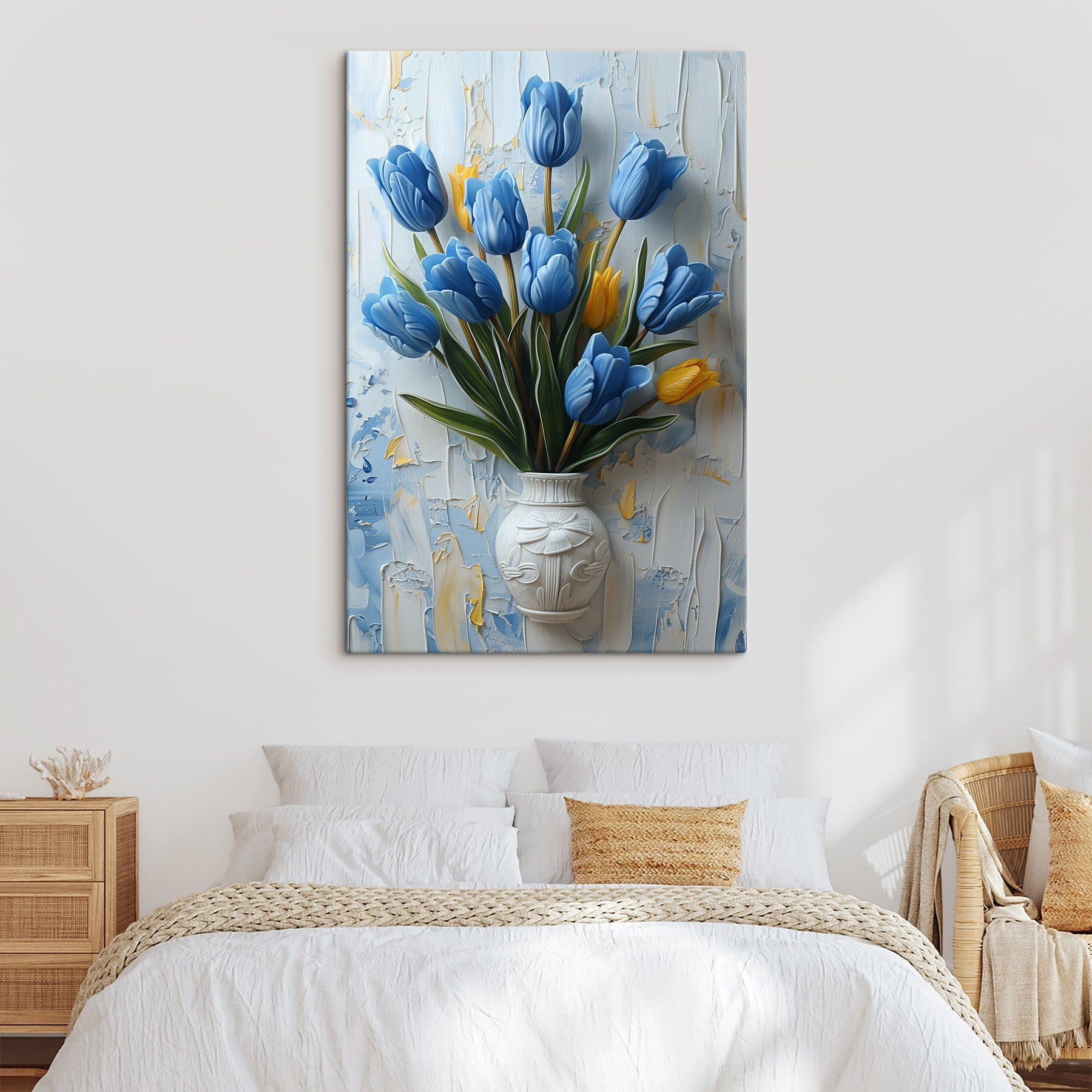 Înveseliți orice cameră cu această imprimare încântătoare pe pânză cu o vază de lalele albastre. Este ca și cum ai aduce o bucată de primăvară în casă, fără strănut. Culorile vii ies în evidență pe un fundal moale, creând o atmosferă primitoare care încălzește inimile. Imaginați-vă această operă de artă încântătoare într-un colț confortabil, stârnind bucurie și conversație de fiecare dată când cineva trece pe lângă ea. Perfectă pentru cei care apreciază florile, dar nu au degetul mare verde. În plus, vă reamintește să vă opriți și să mirosiți lalelele – figurativ, desigur. Doar agățați-o și lăsați sentimentele bune să curgă!