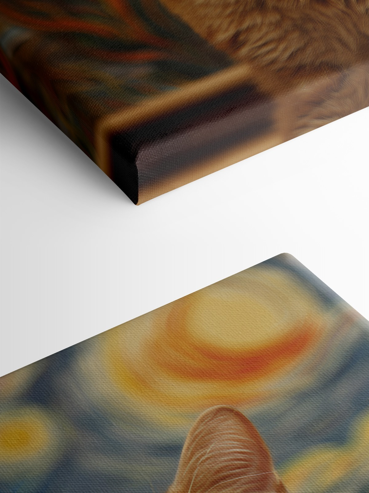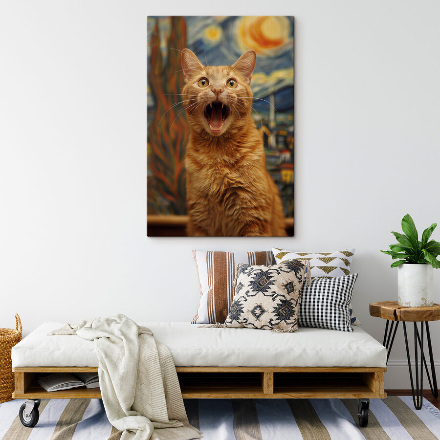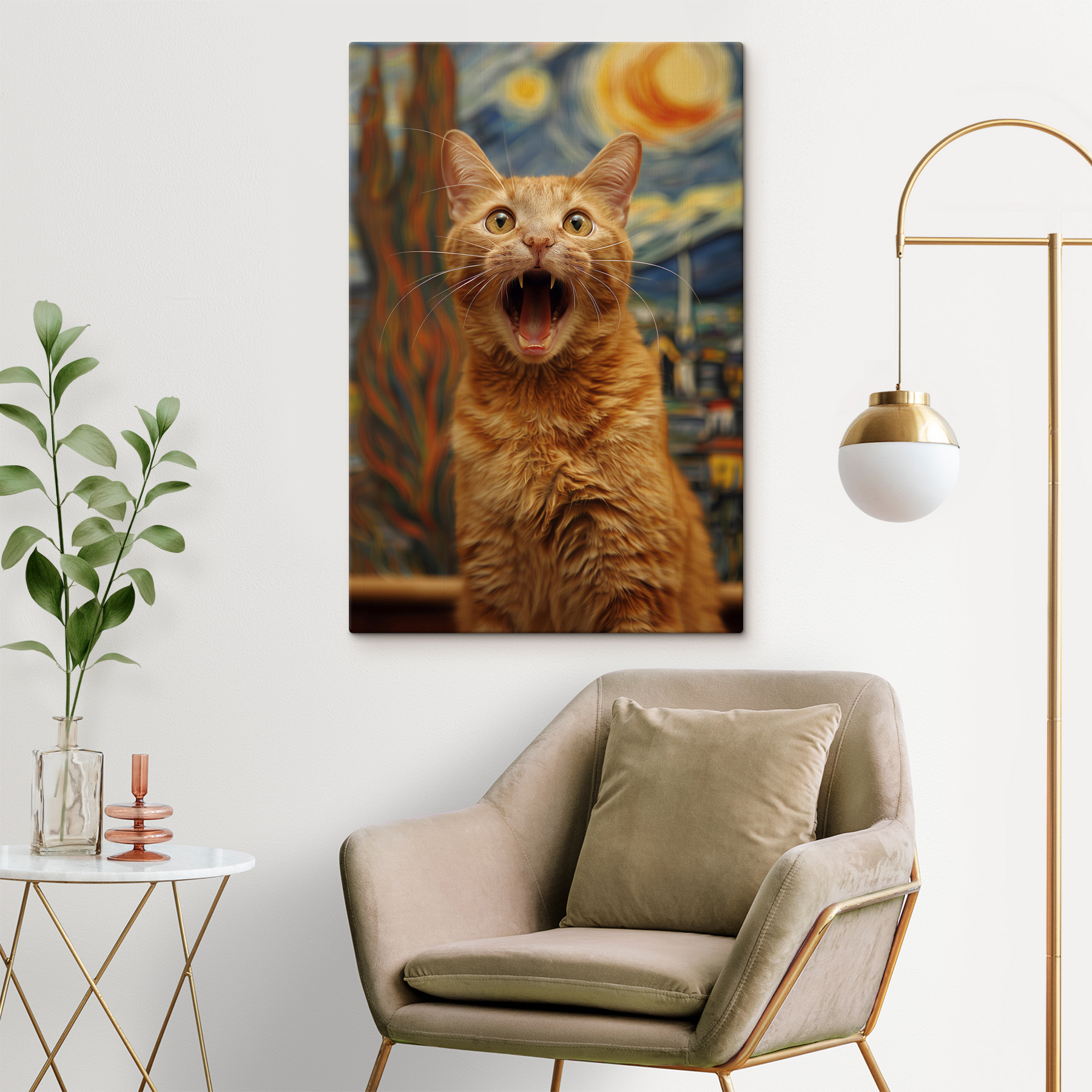 Este ca și cum pisica s-ar gândi: “Ce naiba se întâmplă aici?”. Și sincer, nu este aceasta o întrebare pe care ne-o punem cu toții uneori? Imaginați-vă că acest print stârnește o mulțime de conversații sau pur și simplu aduce un zâmbet după o zi lungă. Culorile sunt vibrante, iar juxtapunerea felinei contemporane cu un strop de artă plastică creează o piesă fermecătoare și de neuitat. Așezați-o într-un loc care ar avea nevoie de puțină fantezie – oaspeții dvs., oameni și feline deopotrivă, vor fi încântați!