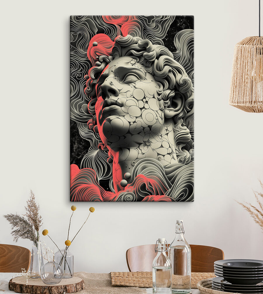 Imaginați-vă o piesă izbitoare care atrage privirea fără efort și stimulează imaginația. Această imprimare pe pânză, care prezintă o statuie a unui bărbat, nu este doar artă; este un starter de conversație. Cu vârtejuri îndrăznețe și curbe moi care dansează în jurul unei figuri clasice, creează un contrast intrigant care șoptește povești vechi, menținând în același timp lucrurile proaspete și moderne.